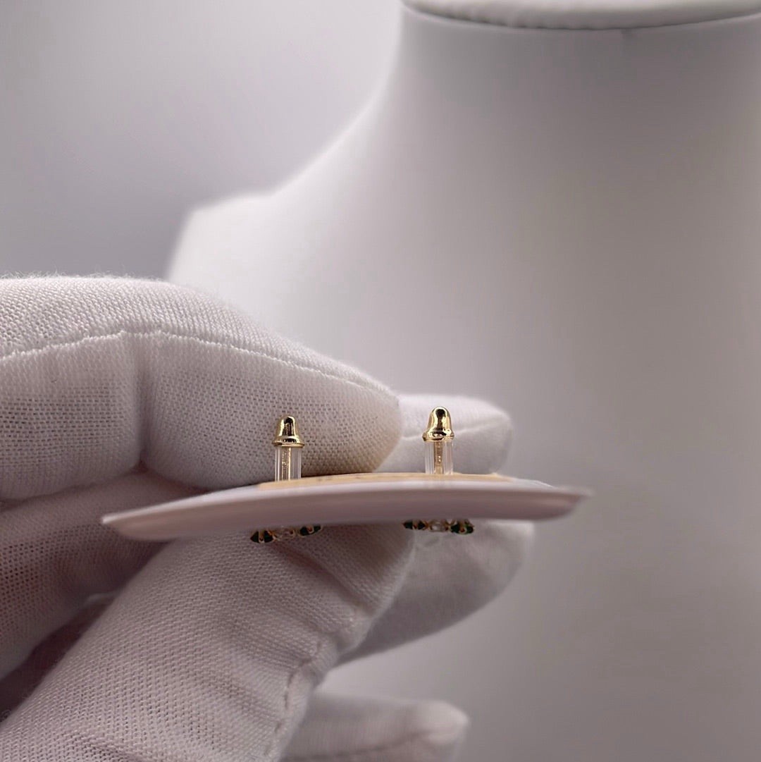NEW 14K Yellow Gold stud earrings religious theme with 2 green and 1 white zirconia stone. Made of 14k yellow gold. 100% Real 14k Yellow Gold Guaranteed Buy with confidence from W.G Item # 00115 **Willy gold buy with confidence* *All items are shipped in beautiful gift box. *