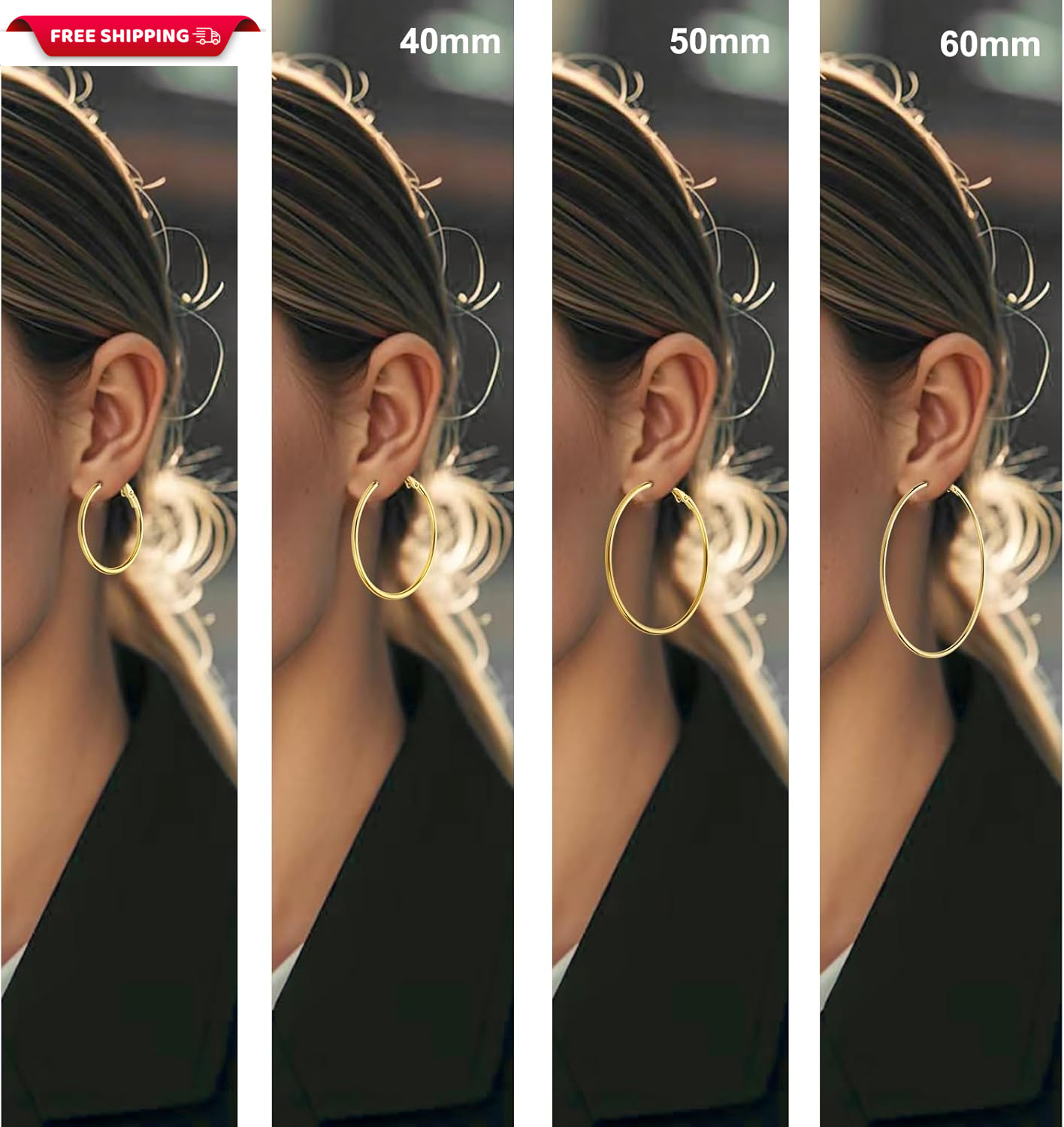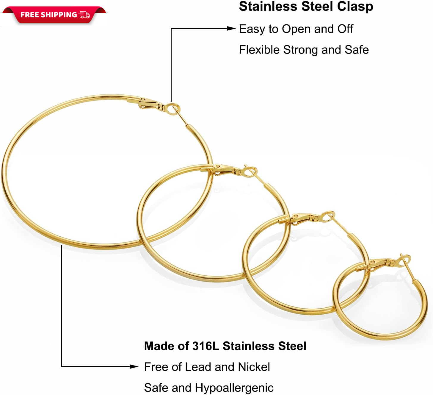 Gold Hoop Earrings for Women - 14K Gold Plated Hypoallergenic Stainless Steel Gold Earrings Set, Lightweight Large Small Gold Hoops Jewelry, 4 Pairs Gold Hoop Earrings for Women Hypoallergenic 1. 4 Pairs Gold Hoop Earrings Each order includes pack of 4 pairs of different size gold hoop earrings for women. (30mm/40mm/50mm60mm) One set can meet your various occasions and wearing needs, enhance your daily fashion decoration color! 2. 14K Gold Hoops These gold hoop earrings are 14k gold plated and Hypoallergenic, Nickel and Lead-Free. High polished, can keep a long time color. Don't worry about tarnish or fade over time. These gold hoops will bring you a better wearing experience. 3. Lightweight comfortable Hoops These 4 pairs gold earrings are lightweight and comfortable to wear. Stainless steel gold earrings trendy jewelry for women. 4. Hypoallergenic Earrings 14k gold hoop earrings with 925 sterling silver 20 gauge earring post , nickel-free and lead-free hypoallergenic hoop earrings for women's sensitive ears. 5. Widely Used Gold Hoops Ready for giving, Engagement, Wedding, Anniversary Day, Birthday to your girlfriend, wife, mom, Friend, Valentine's Day or Christmas Day, yourself or someone special. Gold hoop earrings set for women; Item model number I929-Gold-Hoop-Earrings Gem Type No Gemstone Color Gold Material Stainless Steel Model number I929-Gold-Hoop-Earrings Department womens Back finding Clip On Package Dimensions 4.5 x 3.5 x 0.45 inches; 0.64 ounces Clasp Clip on Earrings Shipping Fast shipping is very important for us. Our standard US shipping service is FREE. Your order will be shipped within 1-3 business days upon full payment received. Your order will be delivered within 1-3 business days after the handling time. We reserve the right to cancel any order for any reason at any time. We are not responsible for undeliverable addresses. We are not responsible for undeliverable addresses. Returns and payment We offer a 30-day return policy from the date of payment received. This return policy covers Incorrectly Shipped items, Broken or Damaged items, Items that do not match the Product description and Picture. Medicines, Pills, Creams, Gels, Food Supplements and products that cannot be reused after opening cannot be returned. For example; cat litter, powder detergent, salt, liquid products, etc. FeedBack Your feedback is very important to us, please leave us positive feedback once you receive your package and satisfied with our service. If you have any problems with your order, please contact us using the eBay communication system before leaving feedback. Please visit our eBay store to check out other items for sale! Thank you for shopping at our store.