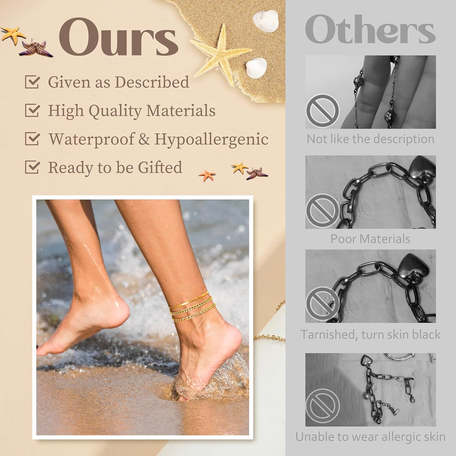 Absolutely love these anklets! The 14K gold plating gives them a luxurious look, and the waterproof stainless steel means I can wear them anywhere—even at the beach. The adjustable fit is perfect, and the variety of styles (heart, Cuban link, herringbone) makes it easy to mix and match. Great quality for the price, and they arrived quickly. Perfect summer accessory or gift!