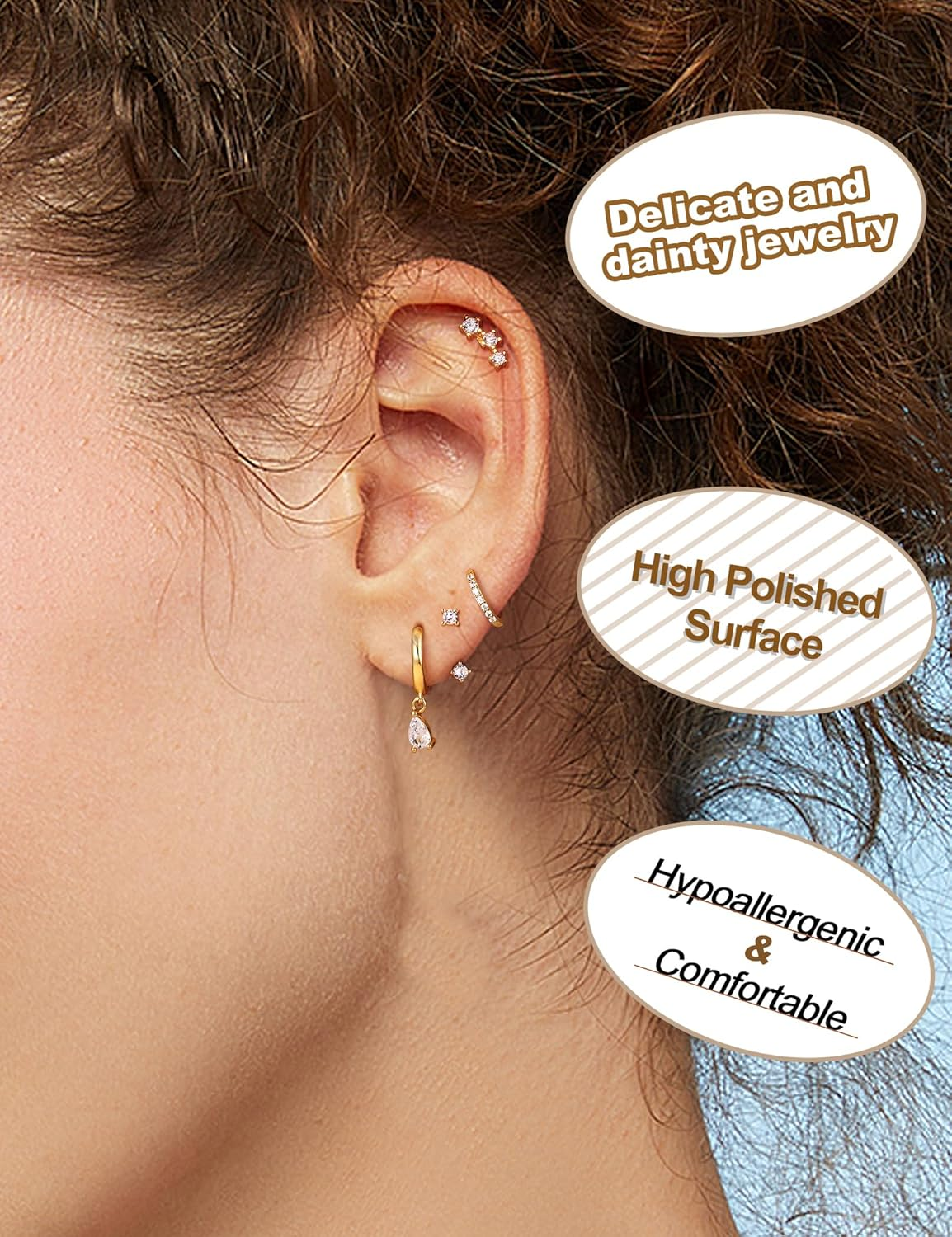 Store New Arrivals Add to Favorite View Feedback Contact Fast deliveries to the customer's home Quality customer service Sophia makes the customers happy! 14K Gold Plated Earring Sets for Women Dainty Stud Huggie Hoop Earrings for Multiple Piercing Hypoallergenic Small Hoop Dangle Earrings Cartilage Earring Set Description **FIBO STEEL Earrings Sset for Multiple Piercing: Elevate Your Style with Comfort and Elegance** **Why Choose FIBO STEEL?** Our earrings set addresses common buyer pain points by offering a versatile solution for multiple piercings. Whether you're looking for small gold stud earrings for women or comfortable earrings to sleep in, our collection has something for everyone. The dangle earrings stacks add an element of playfulness, while the huggie hoops offer a chic, minimalist vibe. Explore the world of FIBO STEEL today and find your perfect pair! Metal stamp 14K Gem Type Cubic Zirconia Color 14k gold-Water drop Material Copper Metal Copper Department womens Back finding Hinged Hoop Package Dimensions 0.39 x 0.2 x 0.2 inches; 0.02 ounces ABOUT US We offer the best prices around on high quality products. Our E-store includes media such as books, movies, music and games while offering electronics, toys, sporting apparel, clothing, tools, general home, garden items and more. SHIPPING We are always working hard to ensure your package arrives as soon as possible. Please understand that some factors like weather, high postal traffic, and the performance of shipping companies are outside of our control. We offer free shipping to the lower 48 states and ship within 2 business days of payment, usually sooner. We do not accept P.O. Boxes. Please provide a physical address. For shipping outside of the continental USA, we only use eBay's Global Shipping Program. The item is shipped to KY and then sent to the rest of the world. International customers are responsible for all duties and taxes. Continue to 'check out' to calculate costs for shipping the item to your country. Messages regarding eBay's Global Shipping Program MUST be directed at eBay EXCLUSIVELY. RETURNS We offer a 30-Day Return Policy on items in which you are not completely satisfied with. You have the option of a full-refund or an exchange of the item. No returns are available on items shipped outside of the USA PAYMENT We accept PayPal. CONTACT US This page content is yet to come Please ad us to your favorite seller and visit again later Thank You CUSTOMER SATISFACTION We try our very best to make sure every customer is completely satisfied. If there's a problem, message us! We're happy to help. WE ACCEPT
