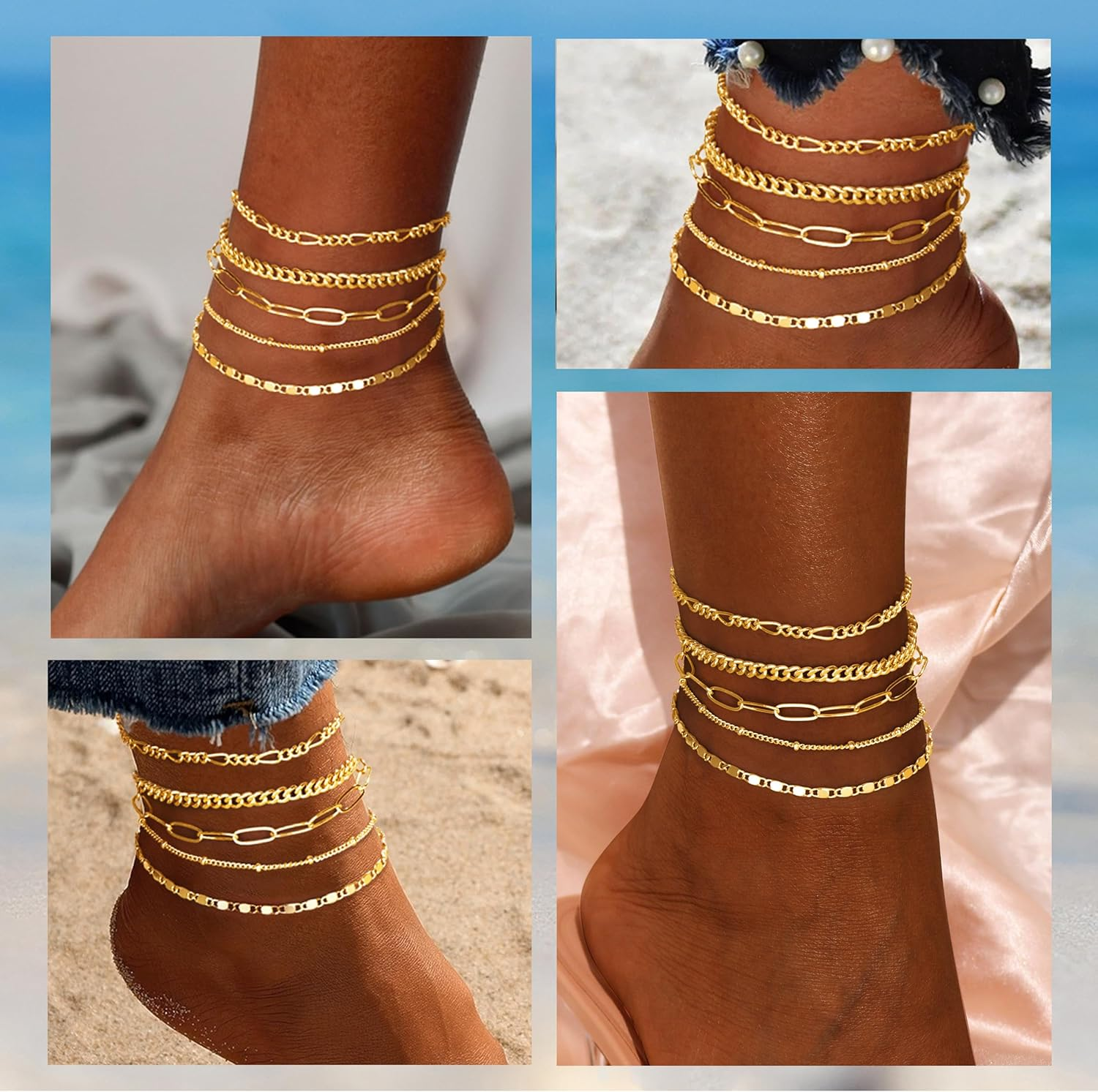 Absolutely love this anklet set! The 14K gold finish is stunning and looks so elegant layered together. Perfect for summer—lightweight, adjustable, and waterproof, so I can wear it anywhere. The Figaro chain adds a chic boho vibe, and the lobster clasp keeps it secure. Great quality for the price, and it arrived fast. Highly recommend as a gift or treat for yourself!