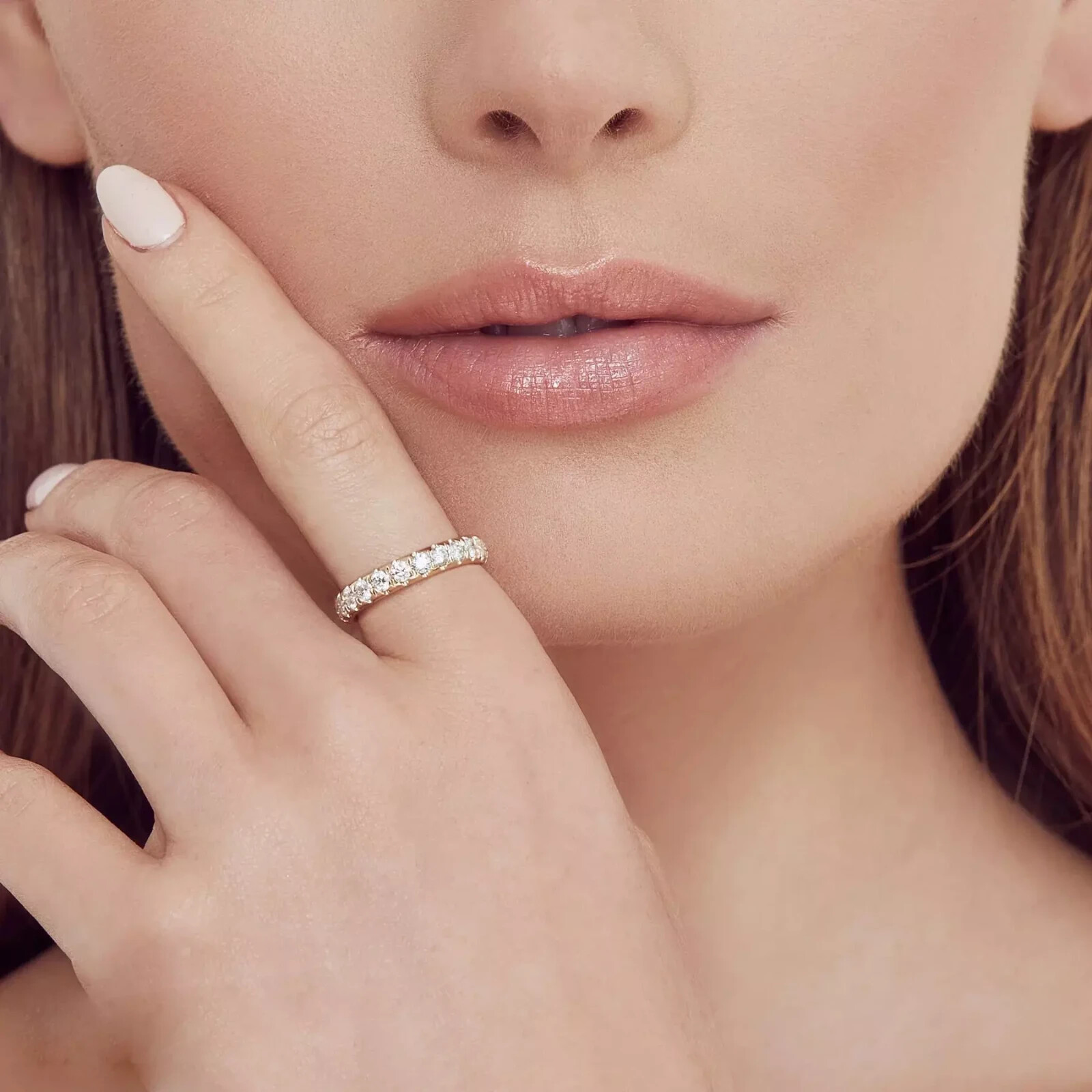 14 karat rose gold diamond eternity ring with 100% natural, genuine diamonds. Not enhanced, not treated, not lab created. All diamonds are matching in cut, color, clarity, and size.