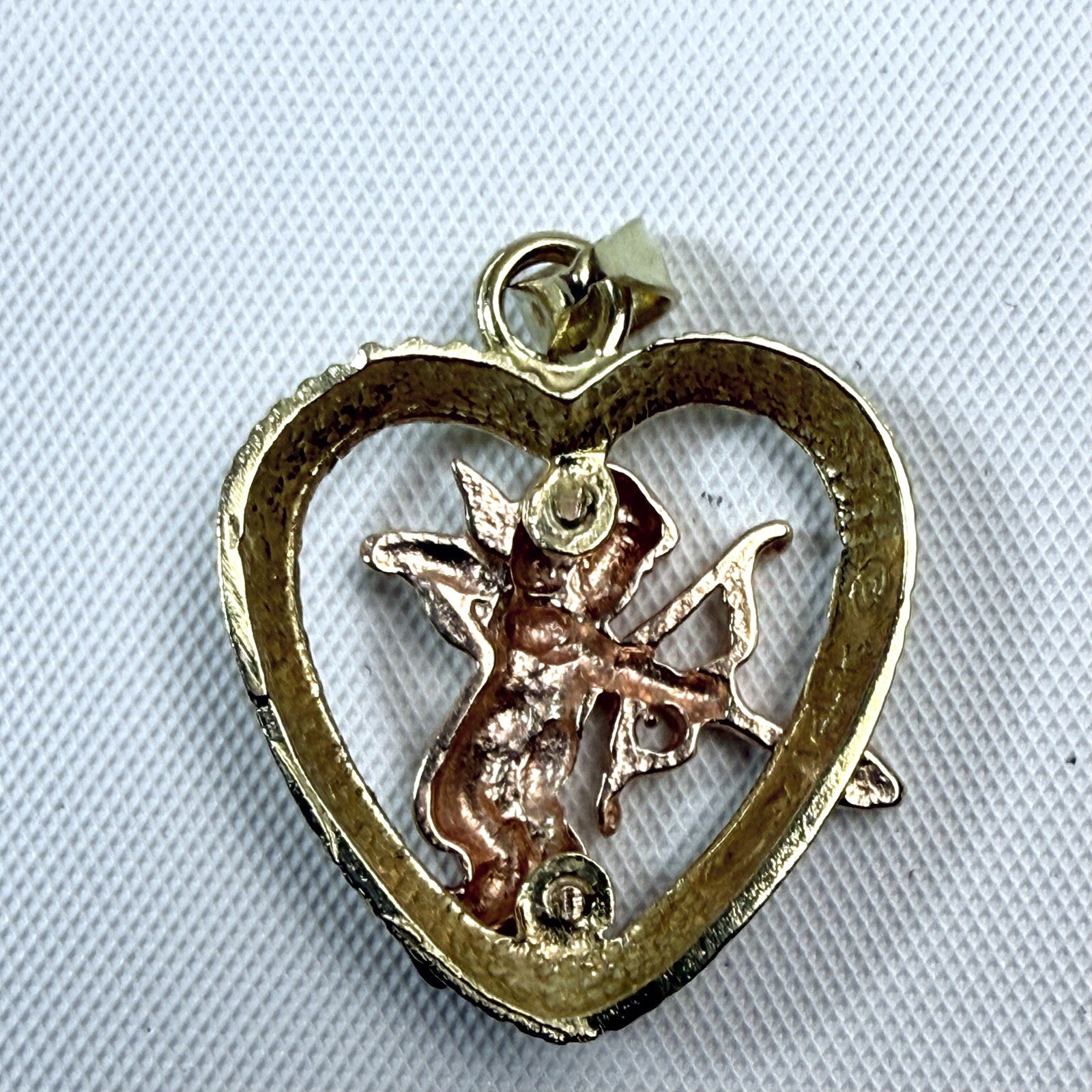 14K Gold Cupid Arrow Heart Charm Pendant Two Tone Rose Yellow Super cute pre owned Cupid heart pendant in 14K yellow and rose gold nice pre owned condition with little to no signs of wear Measures approximately .5" wide by .75" tall not including the bale The picure shows black on the inner rim of the heart but this is a shadow from my lighting