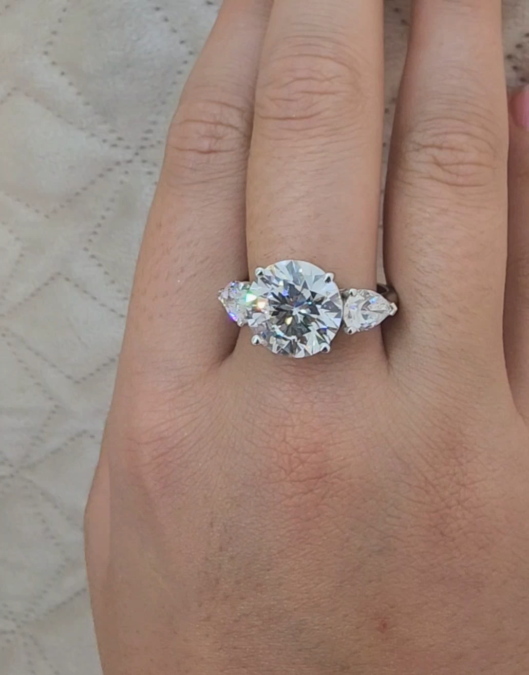 π 14K white gold ring with a round moissanite center and two pear-cut side stones. Celebrate elegance with this handcrafted 14K solid white gold ring. The centerpiece is a brilliant round moissanite, flanked by two shimmering pear-cut moissanite side stones. Designed for timeless sophistication, this ring is perfect for engagements, anniversaries, or as a luxurious gift. Made with ethically sourced stones and exceptional craftsmanship. π© Order Note (for buyers): π Please include your ring size in the order notes. Custom gold colors available upon request (White, Yellow, or Rose 14K). π Gemstone Details: Center Stone: 4.00 Ct Round cut Moissanite D VVS Side Stone: 2 Pear cut Moissanite (~1.50 Ct total) D VVS Setting: Prong Finish: High polish Handmade in Israel π Customization Options: Ring Sizes Available: US 4 to 12 Also available in Yellow or Rose Gold π© Please include your preferred size and gold color in the order notes or message us. π What's Included: Elegant gift box Free express worldwide shipping 30-day return policy π Ideal For: Engagement β’ Wedding β’ Special Gift β’ Love & Milestone Moments π¬ Questions? Weβre here to help! Message us anytime for custom requests, sizing, or special orders.