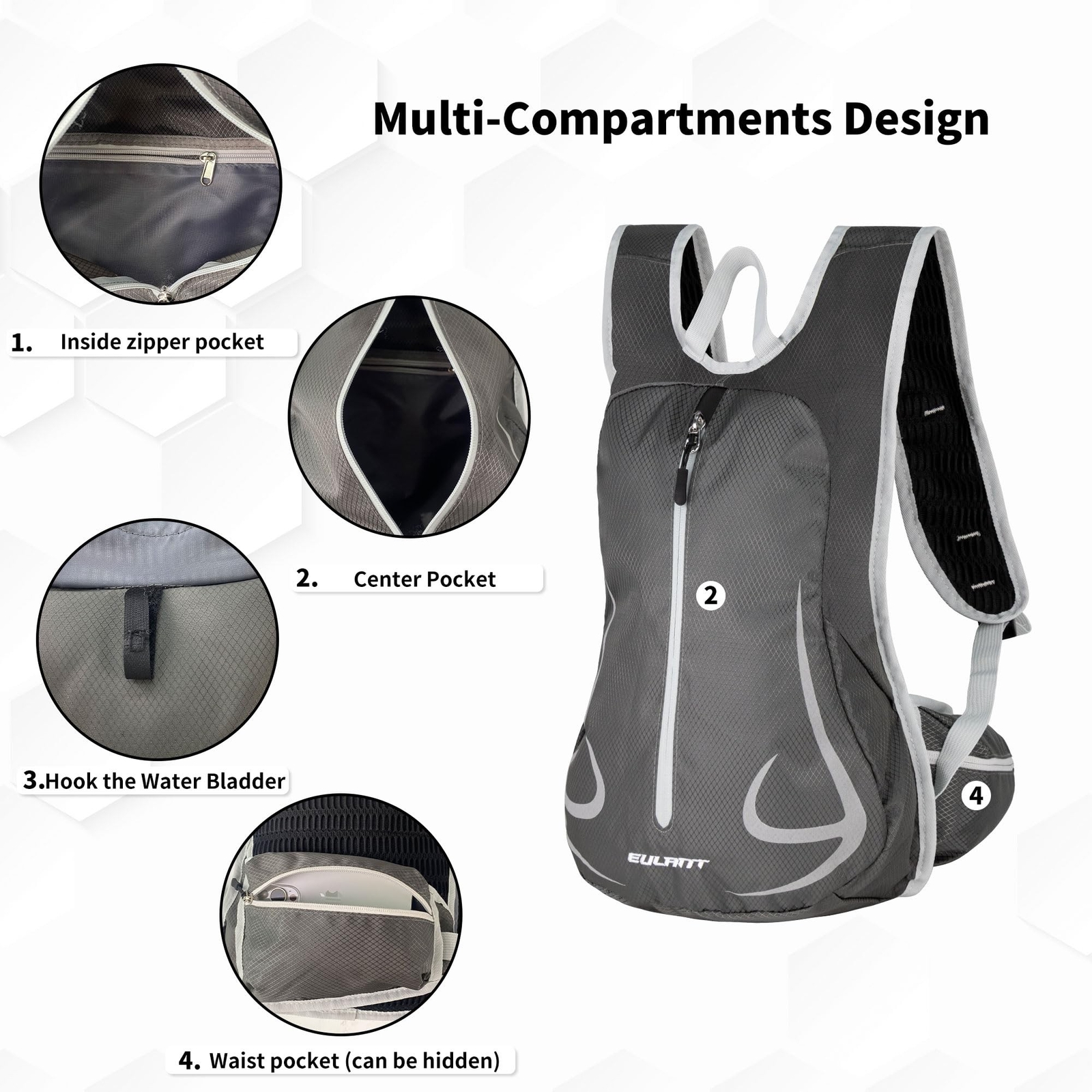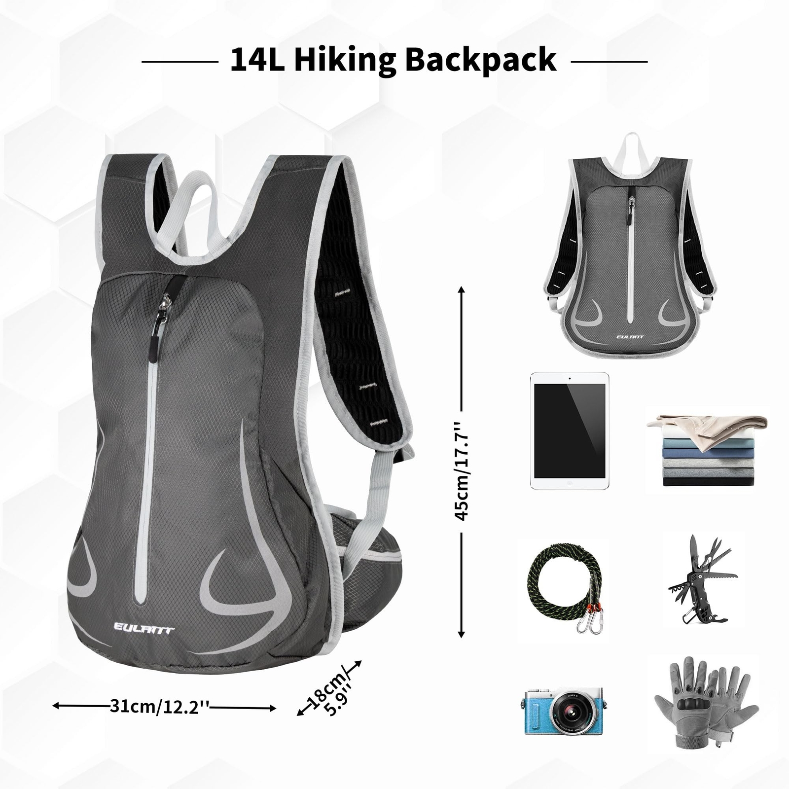 14L Hiking Backpack Lightweight Cycling Daypack with Reflective Stripes for Traveling Skiing Trekking Product Details Color: Grey Brand: YEEKORO MPN: 1998-B01 UPC: Does not apply EAN: Does not apply Item Package Dimensions L x W x H: 3.9 x 1.9 x 0.88 inches Package Weight: 0.11 Pounds Item Dimensions LxWxH: 18 x 13 x 7 inches Brand Name: YEEKORO Color: Grey Material: Nylon Suggested Users: unisex-adult Part Number: 1998-B01 Style: Modern Outer Material: Nylon Sport Type: Travelling, Hiking Age Range Description: Adult Capacity Total: 14 Liters Date First Available: May 31, 2024 Exceptional DurabilityOur hiking backpack is crafted from premium waterproof nylon, fortified with a robust 600D Oxford PU coating, this hiking backpack is your reliable companion. (Furthermore, it should be noted that the backpack's back and zipper are not waterproof, so our backpack can only protect against light rain. It is not suitable for heavy rain or extreme weather conditions.) Note: not included water bladder. Lightweight and Unparalleled ComfortThe lightweight daypack weighing a mere 0.75 lbs, this lightweight backpack is designed for extended wear without strain. The newly upgraded padded shoulder straps, chest strap, and waist straps ensure optimal comfort and support, while the padding on the back offers unmatched relief for pressure points, ensuring a comfortable journey, no matter the duration. Versatile and Intuitive DesignOur hiking backpack sized at 13 x 7 x 18 inches and boasting a 14L capacity. Featuring a myriad of compartments, including a secure main zippered section, a hidden pocket on the back side for items such as wallets, phones, keys, this backpack suits the diverse needs of cyclists, campers, travelers, and skiers, adds a layer of convenience to the design, adapting to your varying storage needs effortlessly. Enhanced Safety FeaturesOur cycling backpack features reflective strips that increase visibility and safety, especially in low-light or dark conditions. The reflective strips make it easier for others to see you, reducing the risk of accidentsmaking it an essential for commuters and outdoor enthusiasts alike. Security Assurance and Ideal GiftAn ideal choice for hiking, running, camping, walking, and travel enthusiasts, our daypacks make for a thoughtful and practical gift. Our commitment to quality is unwavering, and we stand ready to assist with any queries or concerns you may have, providing you with peace of mind on your journey.