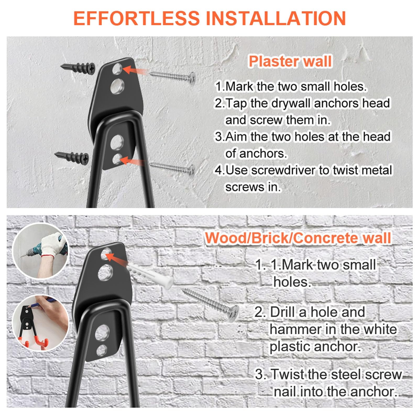 PREMIUM QUALITY AND POWERFUL FUNCTION MAKE STEEL GARAGE HOOKS A GREAT CHOICE FOR YOU FEATURES OF GARAGE HOOKS There are multiple sizes of garage hangers to fit all of your needs ranging from items as big as bicycles to the smaller ones like extension cords. This set of garage hooks comes with all the hardware necessary for use and is heavy enough to handle anything you need. The hanging hooks allow staggering all of your equipment and tools to make the use & nicely organizing your garage space. TIPS TO INSTALL GARAGE HOOKS For plaster walls (1) Mark two big holes. (2) Twist the black wide thread screw plug in. For wooden/brick/concrete walls (1) Mark two small holes. (2) Drill a hole and hammer in the white plastic anchor. (3) Twist the steel screw nail SPECIFICATION Sizes: Large square type hook: .1"(L) x 6.1"(H) x 2.4"(W) Medium square type hook:4.7"(L) x 4.7"(H) x 2.4"(W) Small square type hook: 2.4"(L) x 3.94"(H) x 2.4"(W) Medium J type hook: 4.33"(L) x 5.12"(H) x 1.38"(W) Small J type hook: 2.56"(L) x 3.94"(H) x 1.38"(W) Diameter: Large hole size:0.33" Smaller hole size: 0.23" Length: Steel screw nail: 1.18" Black wide thread screw plug:1.3" White plastic anchor: 1.18" The distance between screw holes: 1.2"-2.0" Note: Please choose according to the size and weight of the items to hang. PACKAGE INCLUDED 2 x Large square type hooks 1 x Medium square type hook 5 x Small square type hooks 1 x Medium J type hook 3 x Small J type hooks 48 x Pcs steel screw nails 24 x Pcs black wide thread screw plugs 24 x Pcs white plastic anchors 1 x User manual QUALITY is our top priority. Get your steel garage hooks today to hang all of these items to clear your floor space making your garage more neat and tidy. 【PREMIUM QUALITY & NON-SLIP COATING】Made of thick steel, steel garage hooks are heavy duty and sturdy. The orange non-slip rubber coating is designed to hold the items firmly, protect their surfaces from getting scratched or marred, and prevent the garage storage hooks from slipping and rusting. Solid steel is not easy to bend and will hold quite a bit of weight if secured properly 【MULTI-FUNCTIONS IN ONE SET OF GARAGE HOOKS】Never have enough room in your garage because of so much stuff? Well, garage hanging hooks are the ideal solution to help utilize your vertical storage space more effectively, get everything organized, and find what you need at a glance. Great for ladders, lawn trimmers, gardening equipment,and so much more! Compared with single hooks, our garage storage utility hooks have two holes to easily hold the weight enabling most items to be hung 【VARIOUS SIZES TO FIT ALL NEEDS】There are 12 wall mounted ladder hooks in 5 different sizes: 2 large square type garage hooks, 1 medium square type garage hook, 5 small square type garage hooks, 1 medium J type garage hook and 3 small J type hooks. It also comes with 48 pcs steel screw nails, 24 pcs black wide thread screw plugs and 24 pcs white plastic anchors. It is ready to use and easy to install. 2 PCS of extension cord straps are for organizing cords, cables, ropes, hoses, and more 【EASY TO INSTALL & BEARING CAPACITY】 These garage hooks are suitable for plaster, wood, brick, and concrete walls. You can install them effortlessly. For plaster walls, (1)Mark two big holes; (2)Twist the black wide thread screw plug in. For wooden/brick walls, (1)Mark two small holes; (2) Drill a hole and hammer in the white plastic anchor; (3) Twist the steel screw nail into the anchor. The bearing capacity depends on different types of walls; different sizes of tool hooks and screws 【GREAT GIFT & SATISFACTORY AFTER-SALE SERVICE】An awesome gift for Fathers’ Day or housewarming for someone! All garage organizer hooks. If any garage hangers are found to be defective or any other problems arise during use, please let us know. Our customer service executive will be there at your service willing to resolve your issue, whatever it may be