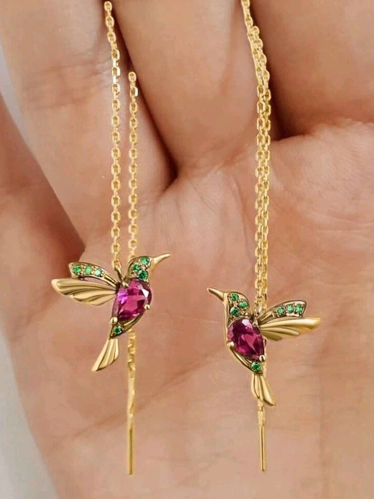 Add a touch of nature’s magic to your style with these stunning 14k Gold Plated Hummingbird Earrings! Crafted in a vibrant gold tone, these long earrings feature a delicate hummingbird with its wings spread in flight, adorned with rich red cubic zirconia and striking green stones. The intricate design captures the beauty of the hummingbird’s graceful energy, making these earrings a captivating statement piece. Perfect for women who love unique, nature-inspired jewelry, these earrings will bring elegance and a splash of color to any look. Embrace the beauty of flight—wear them and let your style soar!