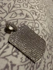 This product is a 14kt white gold pendant with a lab grown diamond in the shape of a dog tag. The diamond color grade is D, meaning it is colorless. The pendant has a total carat weight of 5.18, making it a significant piece of fine jewelry. Crafted in the United States, this pendant features a white gold base metal and a matching white lab grown diamond as the main stone. Its unique design and high-quality materials make it a stylish and elegant accessory for any jewelry lover. CVD top quality lab grown diamonds handset in 14kt white gold very eye catching custom made pendant fits perfect on a tennis chain has a 10mm diamond bail which is suitable for alot of chains pendant itself weighs around 10 grams of 14kt gold all questions feel free to ask!