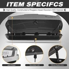 Attachment Type: Screw-On Manufacturer Warranty: 1 Year Placement on Vehicle: Roof Number of Locks: 2 Color: Gray Items Included: Keys, Mounting Brackets, Roof Box Item Weight: 34.32 lbs Brand: VisRack Material: Plastic, Steel Volume: 15.5 ft³ Features: Anti-theft Lock, Easy Installation, Easy Storage, Heavy Duty, Removable, Rust-Resistant, Waterproof, Water-Resistant, Both side opening, Tool free installation, Mecha style design Universal Fitment: Yes Lockable: Yes Item Height: 13 in Type: Cargo Box Item Length: 58.3 in Suitable For: ATV, Car, Trailer, Van UPC: Does not apply Finish: Powder-Coated Maximum Weight Capacity: 130lbs, but 150lbs when Evenly Distributed Item Width: 35.4 in Number in Pack: 1 gtin13: Does not apply Vintage Part: No