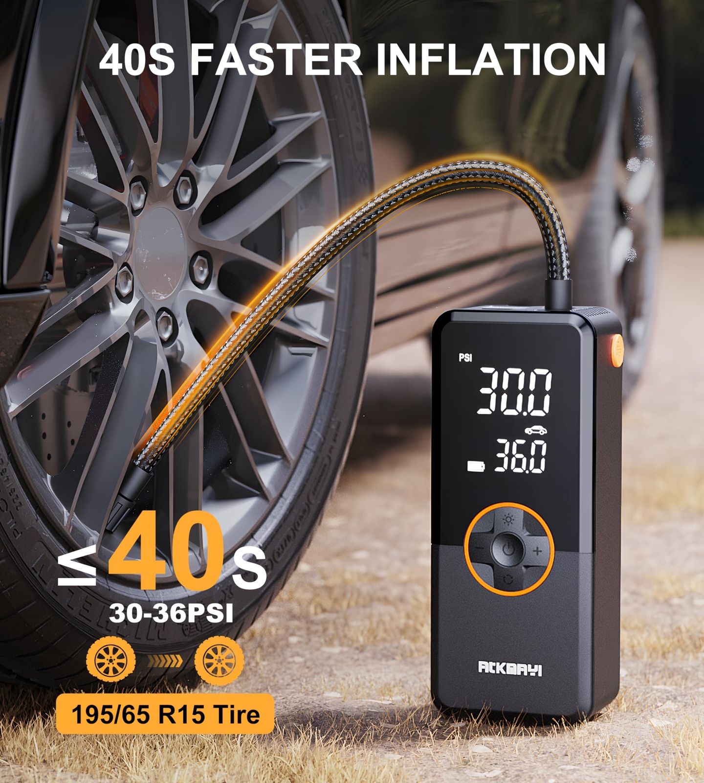 This portable tire inflator is a game-changer! It pumps up my car tires in just 40 seconds and handles bikes, balls, and more with ease. The 150 PSI max pressure and multiple preset modes make inflation effortless. Love the cordless design—super convenient for quick top-ups anywhere. Super fast, reliable, and easy to use!