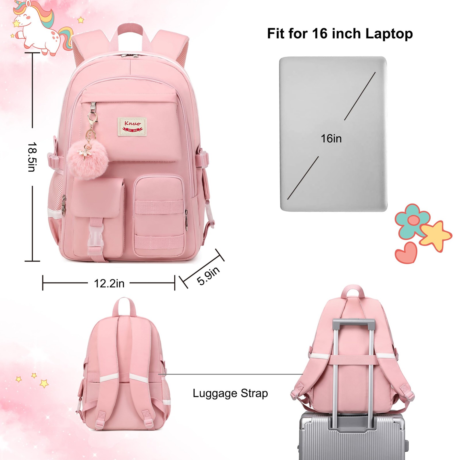 【Large Size】: The size of back pack is 13.8"x7.5"x17.8"(L*W*H), Weight:1.65 LB. The laptop bag with padded compartment sleeve fit for 13.3,15.6 ,16.1 inch tablet. This bag sacks also along with fluffy ball key pendant and personality badge makes the bags more fashionable and unique 【Large Size】: The size of back pack is 13.8"x7.5"x17.8"(L*W*H), Weight:1.65 LB. The laptop bag with padded compartment sleeve fit for 13.3,15.6 ,16.1 inch tablet. This bag sacks also along with fluffy ball key pendant and personality badge makes the bags more fashionable and unique 【Waterproof Material &Smooth Zipper】: The campus backpack is made of waterproof, ultra-lightweight, high density nylon fabric and cute printing polyester lining. The metal zippers closure are used by the premium quality zippers to ensure the long-lasting usage 【Safety & Comfortable 】: The considerate belt on the both side can create a solid base of support if you’re packing a lot of stuffs on the back packs. The Widen and thicken durable S-shape straps is well-padded, adjustable and comfortable to carry. The luggage belt on the back can be fitted on luggage/suitcase to make your travel more convenience 【Multi-compartments & Large Capacity 】: The big book bag has 5 separate different size pockets and two side pockets meet your daily storage. The front three pockets can hold charge device and other small items, convenient for your daily organization. The main pocket of includes laptop padded sleeve with elastic belt and hidden inner zipper pockets. The front tool pockets also come with multiple compartments to provide roomy space for necessities 【For Any Ages & Occasion】 The waterproof backpack purse is stylish enough for casual and student use, while the design provides the multi functionality.Recommended age: 3-14 years old. Backpack perfect for young teens, girls, ladies. The basic multipurpose daypack for most of your needs, easy to match your cloths, suitable for short trip, work, shopping, university, school, etc