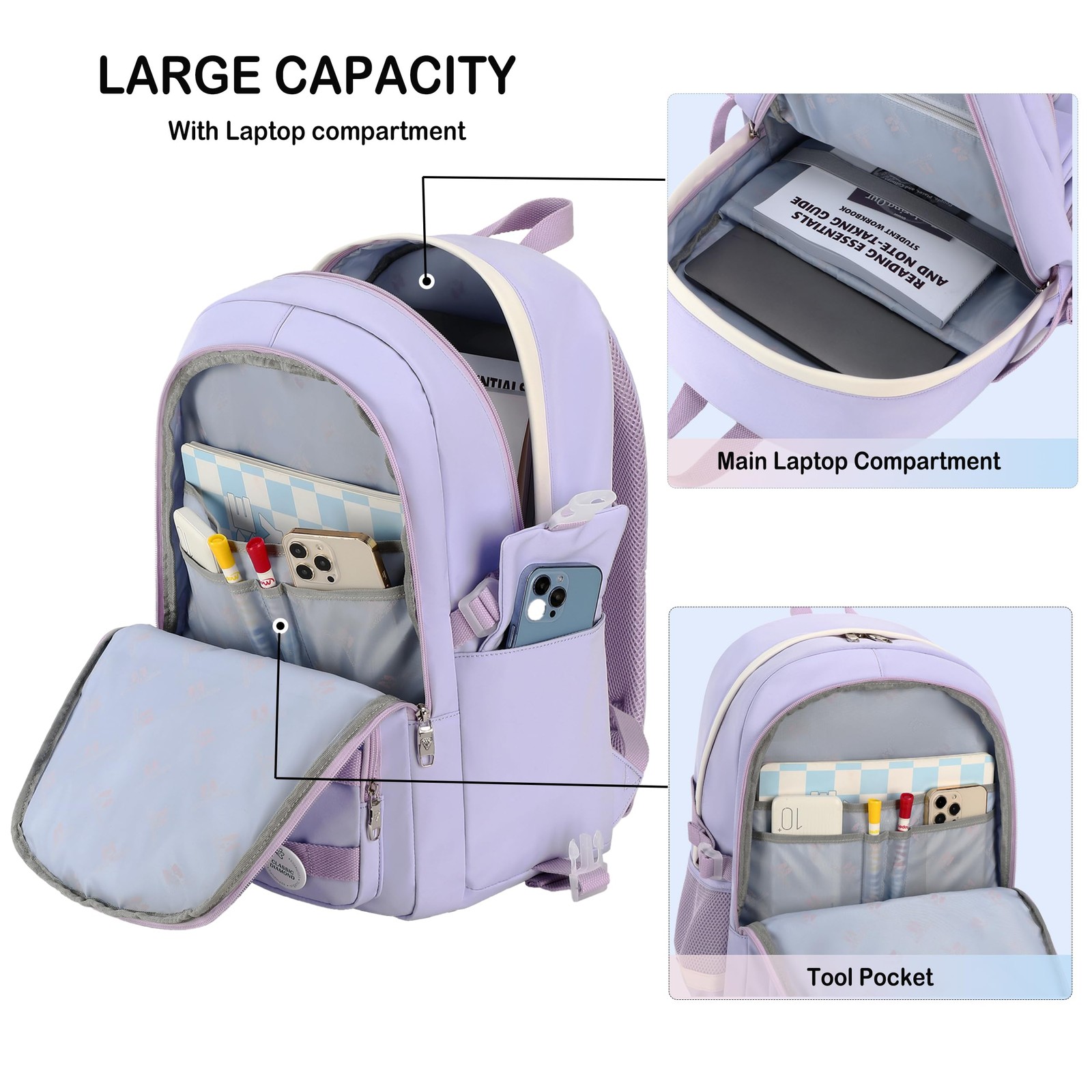 Backpack for Girls School College Backpacks,Recommend age:3-14 【Large Size & Gift】: The size of back pack is 13.8"x7.5"x17.8"(L*W*H), Weight:1.65 LB. The laptop bag with padded compartment sleeve fit for 13.3,15.6 ,16.1 inch tablet. This women book bag also along with fluffy ball key pendant and personality badge as gift makes the bags more fashionable and unique 【Waterproof Material &Smooth Zipper】: The campus backpack is made of waterproof, ultra-lightweight, high density nylon fabric and cute printing polyester lining. The metal zippers closure are used by the premium quality zippers to ensure the long-lasting usage 【Safety & Comfortable 】: The considerate belt on the both side can create a solid base of support if you’re packing a lot of stuffs on the back packs. The Widen and thicken durable S-shape straps is well-padded, adjustable and comfortable to carry. The luggage belt on the back can be fitted on luggage/suitcase to make your travel more convenience 【Multi-compartments & Large Capacity 】: The travel backpack for women has 5 separate different size pockets and two side pockets meet your daily storage. The front three pockets can hold charge device and other small items, convenient for your daily organization. The main pocket of includes laptop padded sleeve with elastic belt and hidden inner zipper pockets. The front tool pockets also come with multiple compartments to provide roomy space for necessities 【For Any Ages & Occasion】 The waterproof backpack purse is stylish enough for casual and student use, while the design provides the multi functionality. Backpack perfect for young teens, girls, ladies. The basic multipurpose daypack for most of your needs, easy to match your cloths, suitable for short trip, work, shopping, university, school, etc