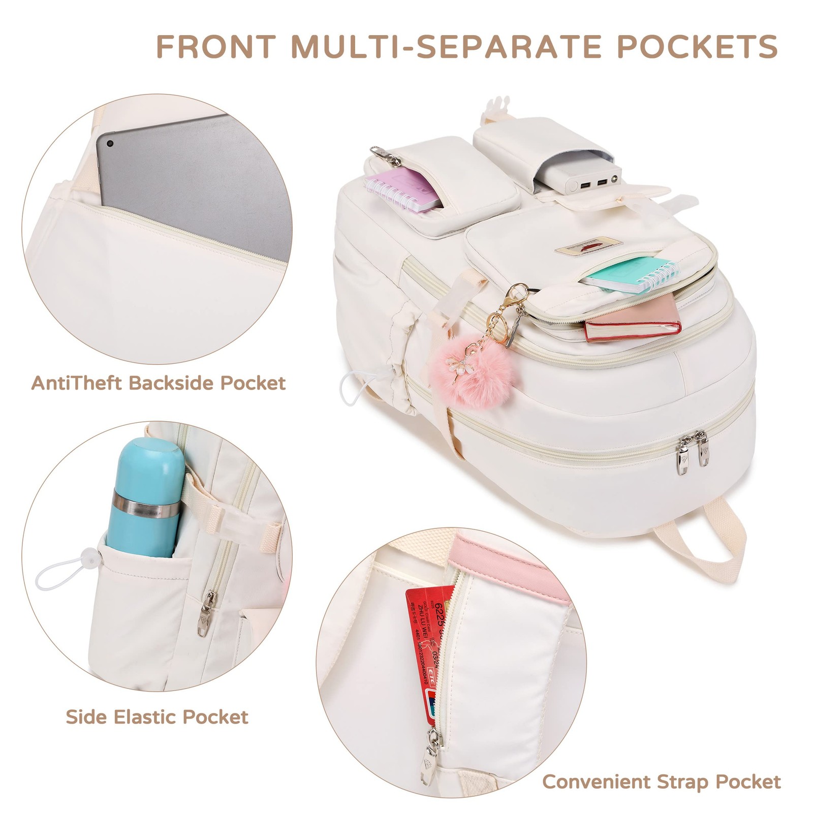 【Large Size & Gift】: The size of back pack is 13.8"x7.5"x17.8"(L*W*H), Weight:1.65 LB. The laptops bag with padded compartment sleeve fit for 13.3,14,16 inch tablet. This women book bag also along with fluffy ball key pendant as gift makes the bags more fashionable and unique 【Waterproof Material &Smooth Zipper】: The middle high school campus backpack is made of waterproof, ultra-lightweight, high density nylon fabric and cute printing polyester lining. The metal zippers closure are used by the premium quality zippers to ensure the long-lasting usage 【Convenient & Comfortable 】: The considerate belt on the both side can create a solid base of support if you’re packing a lot of stuffs on the knapsack. The Widen and thicken durable S-shape straps is well-padded, adjustable and comfortable to carry. The luggage belt on the back of bagsack can be fitted on luggage/suitcase to make your travel more convenience. The shoulder strap specifically involves a card pocket for easy put your credit card. 【Multi-compartments & Large Capacity 】: The travel backpack for women has 7 separate different compartments and two side elastic pockets. The front three pockets can hold charge device and other small items. The main compartment of includes laptop padded sleeve with elastic belt. The front tool compartment also come with multiple pockets to provide roomy space for necessities . The back zipper pocket can protect your important items from theft. 【For Any Ages & Occasion】 The lightweight backpacking purse is stylish enough for casual and student use, while the design provides the multi functionality. Backpack perfect for young teens, girls, ladies. The basic multipurpose daypacks for most of your needs, easy to match your cloths, suitable for short trip, travelling,work, shopping, university, elementary school, etc.Recommended Age Grading: 3-14 years old