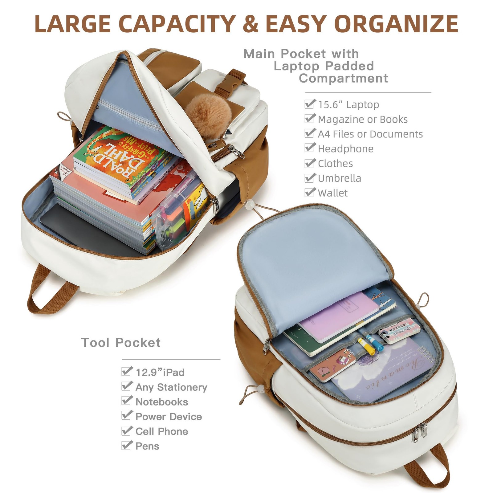 【Large Size & Gift】: The size of back pack is 13.8"x7.5"x17.8"(L*W*H), Weight:1.65 LB. The laptops bag with padded compartment sleeve fit for 13.3,14,16 inch tablet. This women book bag also along with fluffy ball key pendant as gift makes the bags more fashionable and unique 【Waterproof Material &Smooth Zipper】: The middle high school campus backpack is made of waterproof, ultra-lightweight, high density nylon fabric and cute printing polyester lining. The metal zippers closure are used by the premium quality zippers to ensure the long-lasting usage 【Convenient & Comfortable 】: The considerate belt on the both side can create a solid base of support if you’re packing a lot of stuffs on the knapsack. The Widen and thicken durable S-shape straps is well-padded, adjustable and comfortable to carry. The luggage belt on the back of bagsack can be fitted on luggage/suitcase to make your travel more convenience. The shoulder strap specifically involves a card pocket for easy put your credit card. 【Multi-compartments & Large Capacity 】: The travel backpack for women has 7 separate different compartments and two side elastic pockets. The front three pockets can hold charge device and other small items. The main compartment of includes laptop padded sleeve with elastic belt. The front tool compartment also come with multiple pockets to provide roomy space for necessities . The back zipper pocket can protect your important items from theft. 【For Any Ages & Occasion】 The lightweight backpacking purse is stylish enough for casual and student use, while the design provides the multi functionality. Backpack perfect for young teens, girls, ladies. The basic multipurpose daypacks for most of your needs, easy to match your cloths, suitable for short trip, travelling,work, shopping, university, elementary school, etc.Recommended Age Grading: 3-14 years old