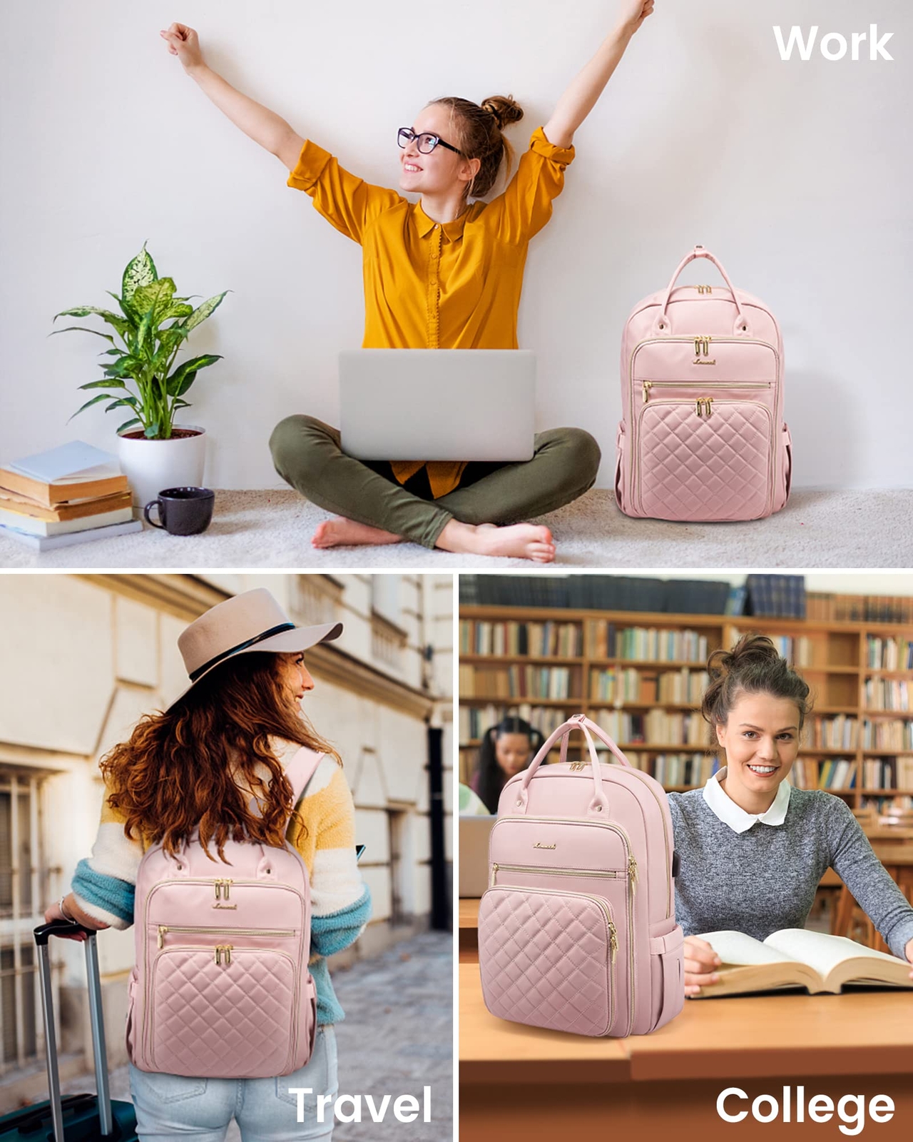 【Ample Space】 With 4 compartments and 18 pockets, this Travel Work Computer Backpack for Women boasts a 27-liter capacity, making it perfect for work, travel, study or daily light use. At 16.9 x 12 x 7.9 inches and weighing just 1.73 lbs, it's easy to carry around. It can even hold three-ring binders 【Stylish Design】 This Backpack is a cute and functional choice for teachers and nurses alike. The classic backpack shape and chic quilting pattern make it a fashionable accessory in a range of colors. It's a great gift idea for daughters, relatives, friends and colleagues too 【Guaranteed Quality】 Our backpacks are backed by strict quality inspections, ensuring every batch meets the highest standards. We manually inspect each detail pocket and use water-resistant and durable polyester cloth for the body, with polyester lining on the inside. Lightweight and easy to clean, perfect for camping and day trips 【Secure Laptop Storage】 Our Laptop Backpack features an elastic Velcro strap and thick foam padding to keep laptops up to 15.6 inches safe and secure. It also has a separate compartment for iPads, providing complete protection for all your valuable electronics 【USB Charging】 For the ultimate convenience during travel, this backpack features an external USB charging interface (mobile power supply and charging cable not included), designed to make your journeys smoother. It fits perfectly under most plane seats too! It's a useful travel business backpack for women 【Comfortable & Practical】 The shoulder straps of this laptop backpack are filled with foam for maximum comfort, breathability and decompression. It also features anti-theft pockets on the back, luggage straps, large elastic side pockets, double top handles and double zippers. It's a perfect professional Women Work Laptop Backpack