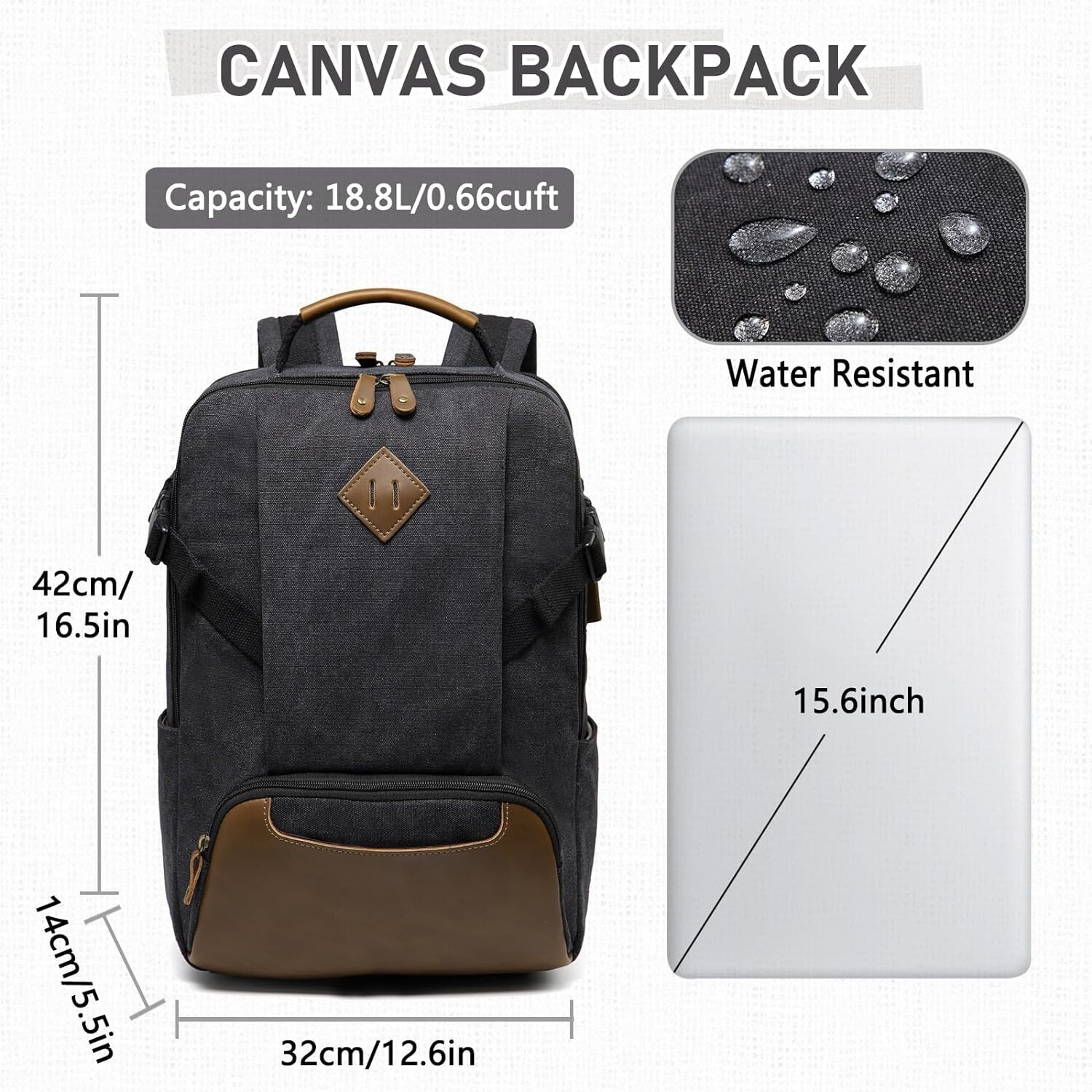 Laptop Backpack Inch Canvas Waterproof Anti Theft Business Travel College Computer Bag Carry on Bag with USB Charging Port for Women Men, Black ▲ High Quality: Perfectly combined with vintage outlook and durability, this vintage backpack functionally shows its two main large compartments with plenty of interior and exterior pockets. This college backpack is sturdy and eco-friendly with the water-resistant canvas. Front faux leather magnetic button pocket and the adjustable side buckle strap nicely maintain its fashion. You could charge your through the USB charging port on-the-go. ▲ Considerate Design: An independent laptop compartment is really convenient for you to carry your laptop and you could take your laptop out without messy searching difficulties. Durable top handle, two-way smooth zippers and padded shoulder strap ensure a comfortable use in this travel backpack. Side buckle safe strap could keep your backpack slim and you don’t need to worry about the bulky shape and security problems. ▲ Well Organization: Besides the laptop compartment, the other large compartment fits you clothes, binders, A4 files or other stuff. Front three zipper compartments for your keys, notebooks while the magnetic pocket for tissues or something could be easily accessible. Two side pockets for your bottle and umbrella. ▲ Large Capacity: Dimensions: 30x11x42cm/, Weight: , Capacity: , Laptop Sleeve Dimensions: 25.5x5x32cm/, Fits up to 15 inch laptop, Shoulder Strap Length: 47-92cm/, Side Pocket:12x16cm/ This capacity is large enough for a travel backpack, gym bag, college backpack, hiking backpack, and the several different pockets are really useful! ▲ Ideal Gift: retro backpack is designed for travel, hiking, sports, and casual daily use. THIS ITEM IS NOT INTENDED FOR USE BY CHILDREN 12 AND UNDER.