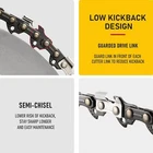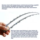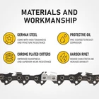 16 Inch Chainsaw Chain Parameters Chisel Type Semi-chisel Guide Bar Length 16 inch Drive Links 56 Pitch 3/8" low profile Gauge .050" Sharpenning files 5/32" Material German steel Brand Lasbargains How-to: Bar and Chain Fit-Up *You can find the parameter on your old saw chain package or the stamp on your guide bar. If you still cannot find them, you must measure the values manually. How to measure? Bar length : Determine guide bar length by measuring from the base of the guide bar to the tip of the bar. Chain Gauge : Chain gauge is the thickness of each drive link. Find your gauge by measuring the section of the drive link inside the groove of the guide bar. Chain Pitch : Pitch is the distance between drive links. Measure pitch by counting three links in a row and dividing by two. Drive Links : Count each drive link to know the total number of drive links on your saw chain. Fit Guide: GREENWORKS 12A Electric 20022, 12A Electric 20232, 2014002AZ, 60V Lithium Ion CS60L00, 60V Lithium Ion CS60L210, CS60L212, CS80L01 CRAFTSMAN 358.34094, 358.34101, 358.34102, 358.34104, 358.34106, 358.34108, 358.34109, 358.34110, 358.34111, 358.34114, 358.34115, 358.34116, 358.34117, 358.34118, 358.3412, 358.34124, 358.34180, 358.34181, 358.34190, 358.34195, 358.3425, 358.3476, 358.35006, 358.35008, 358.35016, 358.35018, 358.35024, 358.35026, 358.35027, 358.35028, 358.35036, 358.35037, 358.35038, 358.35044, 358.35046, 358.35048, 358.35056, 358.35058, 358.35060, 358.35066, 358.35067, 358.35080, 358.35081, 358.35082, 358.35083, 358.35087, 358.35088, 358.35093, 358.35099, 358.35104, 358.35106, 358.35108, 358.35114, 358.35115, 358.35116, 358.35117, 358.35118, 358.35134, 358.35136, 358.35138, 358.35144, 358.35145, 358.35146, 358.35148, 358.35156, 358.35158, 358.35160, 358.35161, 358.35170, 358.35171, 358.35180, 358.35181, 358.35182, 358.35190, 358.35198, 358.35202, 358.35203, 358.35205, 358.35206, 358.35207, 358.35211, 358.35215, 358.35216, 358.35218, 358.35231, 358.35235, 358.35236 , 358.35263, 358.35266, 358.35267, 358.35268, 358.35269, 358.35270, 358.35273, 358.35280, 358.35281, 358.35283, 358.35363, 358.35366, 358.35367, 358.35504, 358.35505, 358.35506, 358.35508, 358.35512, 358.35514, 358.35516, 358.35624, 358.35718, 358.35723, 358.35736, 358.35802, 358.36010, 358.36012, 358.36013, 358.36015, 358.36017, 358.36018, 358.36026, 358.36028, 358.36036, 358.36038, 358.36068, 358.36069, 358.36080, 358.36082, 358.36083, 358.36085, 358.36087, 358.36088, 358.36218, 358.38160, 358.38170, 358.740160, 41136, 41137, 41437, 41526, 41536, 41616, 41716, 41736, 41746, 41845 ELECTRIC, 41846, 41926, 41946, 41950, 59406, 59522, 59525, 59526, 59816, 59826, 59880, 59883, 59886, 59887, 944.416450, 944.41801, CMECS600, CMXGSAMCN4216, CMXGSAMNN4216, S160, S165 POULAN 1220, 1420, 1425, 1625, 1630, 180, 1800, 190, 1900, 1950, 1975, 200, 2000, 2025, 205, 2050, 2055, 2075, 210, 2150, 2155, 2160, 2175, 220, 2200, 221, 222, 225, 2250, 2300, 235, 2350, 236, 2375, 240, 2400, 2450, 250, 2500, 255, 2550, 2555, 260, 2600, 262, 3314 Woodshark, 3416, 3516, 3516AVX, 3816, 400E, 4018, 4218, 4218A, 4218AVX, 967607201, E14E, E16E, ELECTRIC PRO 400E, ES400, Micro 25 XX Series, Micro 25 XXV Series, P3314, P3816, PATRIOT 1900, PL1416, PL3816, PP3516AVX, PPB3416, PPR4218A, PR3816, PR4016, PR4218, S23, S25, Super Micro 25 XX Series, Super Micro 25 XXV Series, WILD THING, Woodshark HUSQVARNA 120 MARK II, 135, 136, 137, 141, 142, 23, 235E, 240, 240E, 243, 316 ELECTRIC, 316E, 33, 334T, 335, 336, 338XPT, 339XP, 34, 35, 36, 37, 38, 41, 536 LIXP, EL 16, EL 316, T435, T540XP HOMELITE 20, 20AV, 23, 23AV, 3300, 3314, 3316, 3318, 3350, 3550, 3800, 3850, EL-12, EL-14, I3350B, PS33, RANGER, UT10514, UT10516, UT10517, UT10530, UT10530A, UT10540, UT10542, UT10544, UT10546, UT10548, UT10549, UT10560, UT10562, UT10564, UT10566, UT10568, UT10569, UT10580, UT10582, UT10584, UT10586, UT10588, UT10589, UT10640, UT10660, UT10680, UT10901, UT10901A, UT10918, UT10926, UT10947A, UT10947D, UT10947E, UT10974A, UT43100, UT43103, UT43120, UT43122, UT43123, ZR10540, ZR10560, ZR10580, ZR10901, ZR10901A, ZR10947, ZR10947A, ZR10947D, ZR43100, d3300, d3350b, d3850, d3850b, z3850 MAKITA 5012B, 5014NB, 5016NB, DCS3000, DCS330S, DCS330TH, DCS34, DCS340, DCS341, DCS3416, DCS3500, DCS3501, DCS390S, DCS400, DCS401, DCS4300, DCS4301, DUC400, EA3200S, EA3201S, EA3201S35B, EA3201S40B, EA3500S, EA3500SRDB, EA3501S, EA3501S40B, EA3600F, EA3601F, EA3601FRDB, EA4300F40B, UC3030A, UC3050A, UC3051A, UC3530A, UC3550A, UC3551A, UC4000, UC4030A, UC4050A, UC4051A, UC4550A, UC4551A, XCU03, XCU04CM JONSERED 2014, 2016, 2036, 2116 EL, 2116E, 2139T, 36, 361, 365, 370, CS 2117 EL, CS 2121 EL, CS 2234, CS 2236T, CS 2238S ECHO CS-280, CS-302, CS-305, CS-306, CS-330 RYOBI RY3716, RY40405, RY40505, RY43006 BLACK MAX bm3716 * Replacement OEM Part: HUSQVARNA 531300446, 585422156, H37-56 POWER CARE Y56 STIHL 3636 005 0056, 63PM356E TRILINK CL15056TL2, S56 * For more compatible models, please scroll down to view the " Product Guides and Documentation " on this page. Raw Materials The raw materials of the main components of the UPFOREST sawchain are directly imported from Germany . This is different from other manufacturers in that they only use imported raw materials in some of the parts, or even do not use imported raw materials. The raw materials of cutters, drive links, tie straps are called 68CrNiMo , rivet is called GCr15 , which is the same raw material used by Stilh. Each batch of raw materials has a product quality inspection report, and passes through our quality inspection department to ensure that our saw chain has the best performance.