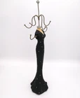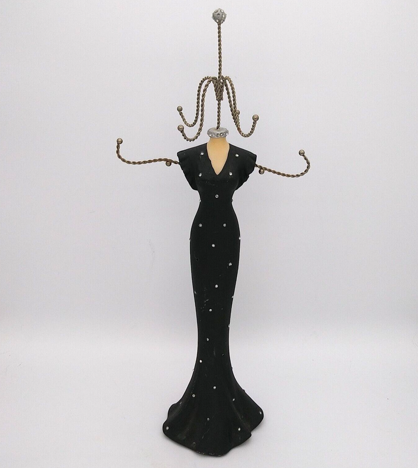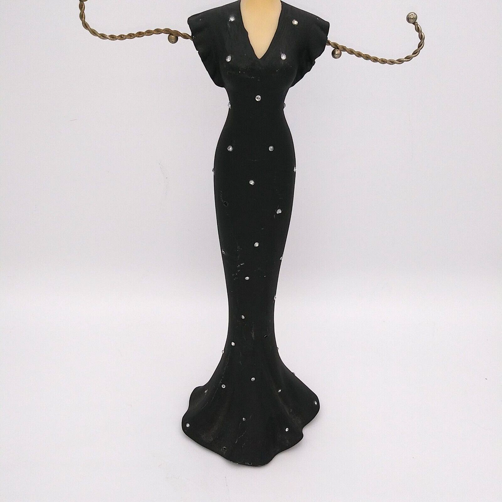 This beautiful female figurine is the perfect holder for your precious fine jewelry. The black faux diamond floor length formal studded dress adds a touch of elegance to any room while also keeping your jewelry organized and easily accessible. Measuring at 16 inches, this necklace and fine jewelry holder is the ideal size for any dresser or vanity. Not only is it functional, but it also serves as a stunning decorative piece that will complement any home decor. With its versatile design, it can fit seamlessly into any room, from the bedroom to the living room. You won't have to worry about the condition of your jewelry when it's safely stored on this holder. Add a touch of sophistication to your space with this beautiful necklace and fine jewelry holder.