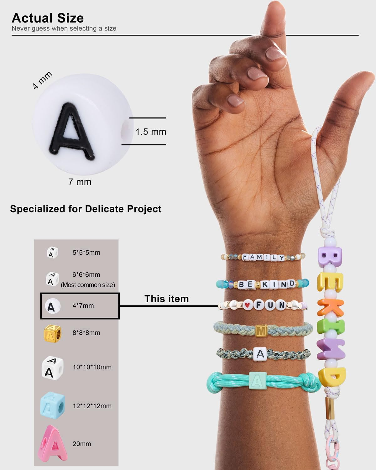 Store New Arrivals Add to Favorite View Feedback Contact 1650 Pcs Letter Beads Kit with Extra Vowels and Numbers, Alphabet Beads for Bracelets Making, Perfect for Friendship Bracelets Description Number of Pieces 1650 Color White Beads with Black Inked Letter Material Acrylic Country of Origin China Item Weight 12.3 ounces Shape Round Size Round 4*7mm Product Dimensions 8.7 x 0.75 x 9.5 inches Spread Goodwill with Short Words. These letter beads are perfect for making friendship bracelets. String song titles, lyrics, inspirational messages, blessings, and other words to share and exchange with others, passing on goodwill. Each Dodobeads alphabet beads kit includes love and peace beads. Large Capacity. This set includes up to 1650 beads. You get 40 beads per letter, and for the five most commonly used letters (A, E, R, I, O), we provide an additional 300 beads in a refill pack. This greatly increases the utilization of the entire set. Number Beads and Spacer Beads. You'll need 100 number beads (0-9) for specific bracelet projects. Our selection also includes 130 pearl beads and gold spacer beads, essential for creating beautiful and rhythmic bracelets. Time-Saving Organization. We've made it easy for you to save time on your project. Each letter is sorted in alphabetical order and neatly stored in its own compartment. With no confusion and no missing pieces, you can spend more time creating and less time searching. Unleash Your Creativity. These alphabet beads are perfect for use with clay, pony, and glass beads. Use them for friendship bracelets, necklaces, keychains, eyeglass chains, and more. They're the perfect addition to your DIY projects and fun to use. Wide Range of Color Options. We offer a wide range of colors and styles, including square, round, gold, white, black, colorful, glow-in-the-dark, and more. With 17 letter beads options, you are fully supported in completing unique projects. Product Description Swipe left and right to see the application of each size letter beads 5×5mm Small letter beads projects show Especially great for delicate projects like stackable bracelets, necklaces, and even brooches! 4×7mm Round letter beads projects show The most commonly used and practical size ever, if this is your first time using letter beads, this is the right size to choose! 6×6mm Square letter beads projects show The most commonly used and practical size ever, if this is your first time using letter beads, this is the right size to choose! 8×8mm Gold metal letter beads show Real metal letter beads made of stainless steel! 10×10mm & 12×12mm large letter beads projects show Ideal for bag charms, key chains, garlands and other projects that need more eye-catching monogrammed beads. 20mm jumbo letter beads projects show Super big, super cute, super eye-catching! Letter Beads~! Gathering! Add to Cart Add to Cart Add to Cart Add to Cart Add to Cart Add to Cart Customer Reviews 4.7 out of 5 stars 496 4.7 out of 5 stars 496 4.7 out of 5 stars 496 4.7 out of 5 stars 496 4.7 out of 5 stars 496 4.7 out of 5 stars 496 Price $17.99 $ 17 . 99 $12.99 $ 12 . 99 $17.99 $ 17 . 99 $24.99 $ 24 . 99 $16.99 $ 16 . 99 $15.99 $ 15 . 99 Size 4.5mm 6mm 10mm 8mm 12mm 20mm Material Acrylic Acrylic Acrylic Stainless steels Acrylic Acrylic Available colors 1 for now 8 8 1 5 6 Applicable projects Delicate Friendship Bracelet Common Friendship Bracelet Bag charm-Keychain-Lanyard Cool Projects Bag charm-Keychain-Lanyard Bag charm-Keychain-Lanyard Coloring process Ink Pouring Ink Pouring Ink Pouring Real 18K gold-plated Skin-like spray paint Plated AB ABOUT US We offer the best prices around on high quality products. Our E-store includes media such as books, movies, music and games while offering electronics, toys, sporting apparel, clothing, tools, general home, garden items and more. SHIPPING We are always working hard to ensure your package arrives as soon as possible. Please understand that some factors like weather, high postal traffic, and the performance of shipping companies are outside of our control. We offer free shipping to the lower 48 states and ship within 2 business days of payment, usually sooner. We do not accept P.O. Boxes. Please provide a physical address. For shipping outside of the continental USA, we only use eBay's Global Shipping Program.The item is shipped to KY and then sent to the rest of the world. International customers are responsible for all duties and taxes. Continue to check out in order to calculate costs for shipping the item to your country. Messages regarding eBay's Global Shipping Program MUST be directed at eBay EXCLUSIVELY. RETURNS We offer a 30-Day Return Policy on items which you are not completely satisfied with. You have the option for a full-refund or an exchange of the item. No returns are available on items shipped outside of the USA. PAYMENT We accept PayPal. CONTACT US This page content is yet to come Please ad us to your favorite seller and visit again later Thank You CUSTOMER SATISFACTION We try our very best to make sure every customer is completely satisfied. If there's a problem, message us! We're happy to help. WE ACCEPT