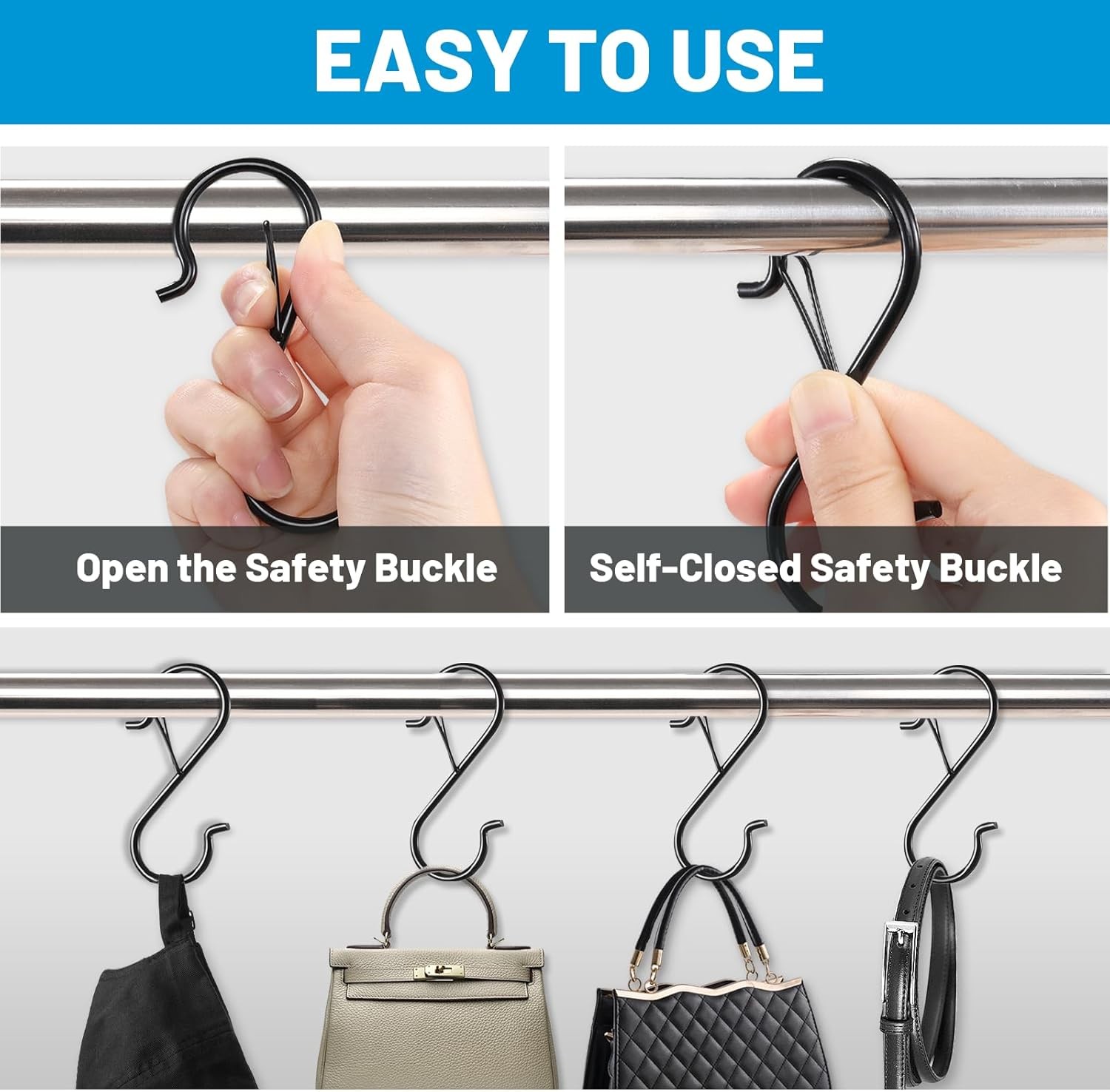 About this item SAFETY BUCKLE - S hooks for hanging desing with an unique locking clip. Compare to ordinary S-shaped hooks, it prevent the hanging objects from falling when strong wind coming, and it improve the safety. It also keep the s hooks function as space saver. STABLE MATERIAL - Heavy duty bbq grill s hooks with latch are made of high-quality stainess steel, coated with anti-rust paint, durable and long service life. Smooth polishing no sharp end, it won't scratch your hands or damage your item. VARIOUS APPLICATION - Utility s hooks for hanging grill tools are great for kitchenware utensils such as as pots, pans, mops, spoons and so on. Beside, It also suitable for use in college dorms,storage room,bathroom,garage,workshop and office, or hanging plant basket, chime, lantern in outdoor. PRACTICAL SIZE - The thickness is 3.8mm which can be able to loading 40 pounds. The buckle side of hook can used on rod with 0.43 inch diameter(Maximum). If your rod diameter is larger than 0.43 inch(1.09 cm), this buckle side is not able to be installed, please notice this! HIGH VALUABLE SET - It comes with 17 anti drop s hanger hooks. It's are enough for your spare or replacement, one purchase can last for a very long time. It's a good helper for home/office/patio/garage space save and organization. › Color: Black Brand: Material: Stainless Steel Finish Type: Steel Mounting Type: Hanging