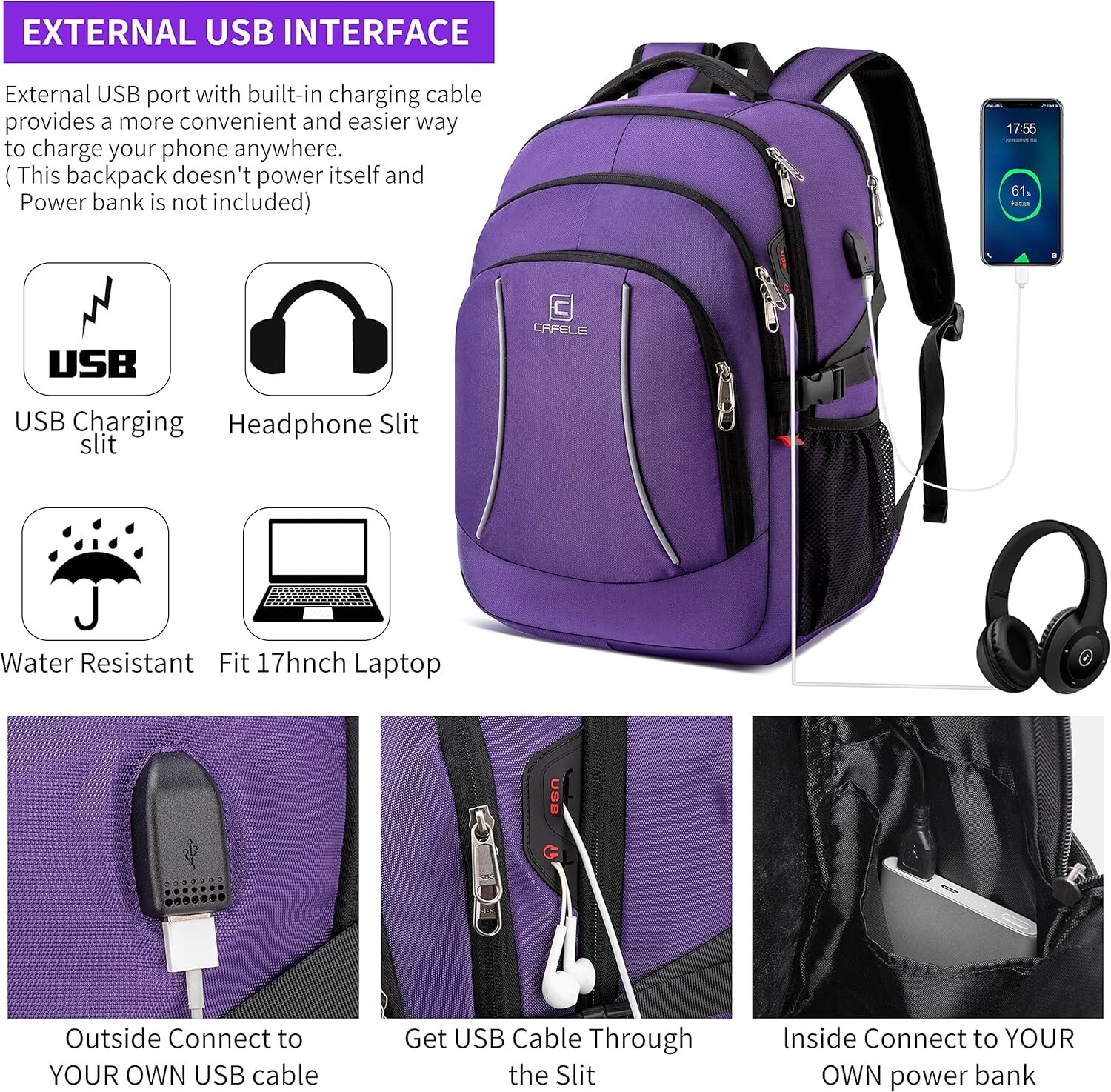 Travel Laptop Backpack, Inch Large Capacity College School Bookbags,RFID Anti Theft Pocket,Durable Water Resistant Backpacks Computer bagpack for Women Girls Teenagers Casual Daypack,Purple Large Capacity and Organized: Men travel backpack owns 20+ independent pockets for large storage and organization for small items. 4 spacious main multi compartments with many hidden pockets can accommodate lots of stuffs like college supplies, travel accessories, stationery, notebook, cord organizer, side elastic net pockets conveniently hold travel gear umbrellas or water bottles. Ideal book bag backpack great gifts for family and friends. Multipurpose RFID BACKPACK & ANTI THEFT: An RFID pocket with RFID function helps protect personal data encoded on your credit card, ID card and big backpack is perfect for indoor/outdoor activities. Served as sturdy large backpack, large school backpack for teen boys/girls, large laptop bag or spacious college backpack, you can use it at anywhere for International travel, camping, hiking and overnight trip. Practical and Convenient: External USB port with set-in charging cable offers convenient charging your cell. A hole for head outside gives easy access to ear , the student backpack with a sturdy rugged handle on the top for carrying, side compression straps keep the exclusive backpack at whatever size you requires. As a men's/women's backpack, you will enjoy it's fashionable, comfortable and convenient BANK is not included) FUNCTIONAL & Comfortable: A well-knitted luggage strap is quite convenient to fix the backpack on the trolley of your luggage, making your journey and travelling more relaxing. Soft multi-panel ventilated padding makes maximum back air flow and support. Breathable and adjustable shoulder straps relieve the stress of shoulder. One sides of the shoulder strap with lanyard design, can hang sunglasses and other small pendants. Premium Book bags for men, also computer backpack for women. DIMENSION & DURABLE MATERIAL - Size of extra large college **, perfect to throw under your seat on an airplane when you are traveling or on business trip.Separate padded laptop compartment fits most 13, 14, 15, , 16, 17, and up to inch laptop/Ipad/ business computer backpack made from high quality polyester fabric shockproof with high density nylon lining for better TEAR & WATER RESISTANT and Lightweight 6 s old.