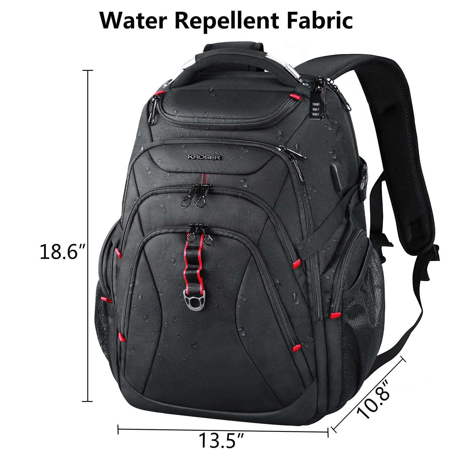 DURABLE MATERIAL: This stylish laptop backpack is made of high-quality water-repellent ballistic fabric; Dimensions: 18.6”x13.5”x10.8”, fits up to 17.3” laptop; Weight: 3.08LBS MULTI-FUNCTIONAL COMPARTMENT: Our large travel backpack with separated compartments and pockets which can provide roomy space for your computer, iPad, power bank, A4 files, wallet, cards, clothes and more your items. A zippered pocket and a mesh one at each side can hold your umbrella, water bottle, etc. A sunglass hard shell zone is designed on the top which is convenient and safe for you to put your sunglass, cell phone etc USB PORT DESIGN: Built-in USB PORT is convenient to charge your cell phone by the connected power bank in a safe way(POWER BANK is not included) FUNCTIONAL & SAFETY: A well-knitted luggage strap is quite convenient for you to fix the laptop bag on the trolley of your luggage, making your journey and travelling more convenient wherever you go. Design of an air-flow back padding system and a secret pocket ensures great comfort and safety in your journey.RFID Pockets with Identity protection function protects date encoded on most IDs, credit cards and passport DURABLE & COMFORTABLE: This practical backpack with a sturdy handle with steel cable on the top for carrying, side compression straps keep the exclusive backpack at whatever size you requires. This laptop backpack is large and durable, which is perfect for College, travel, hiking, camping, business, and outdoor activities
