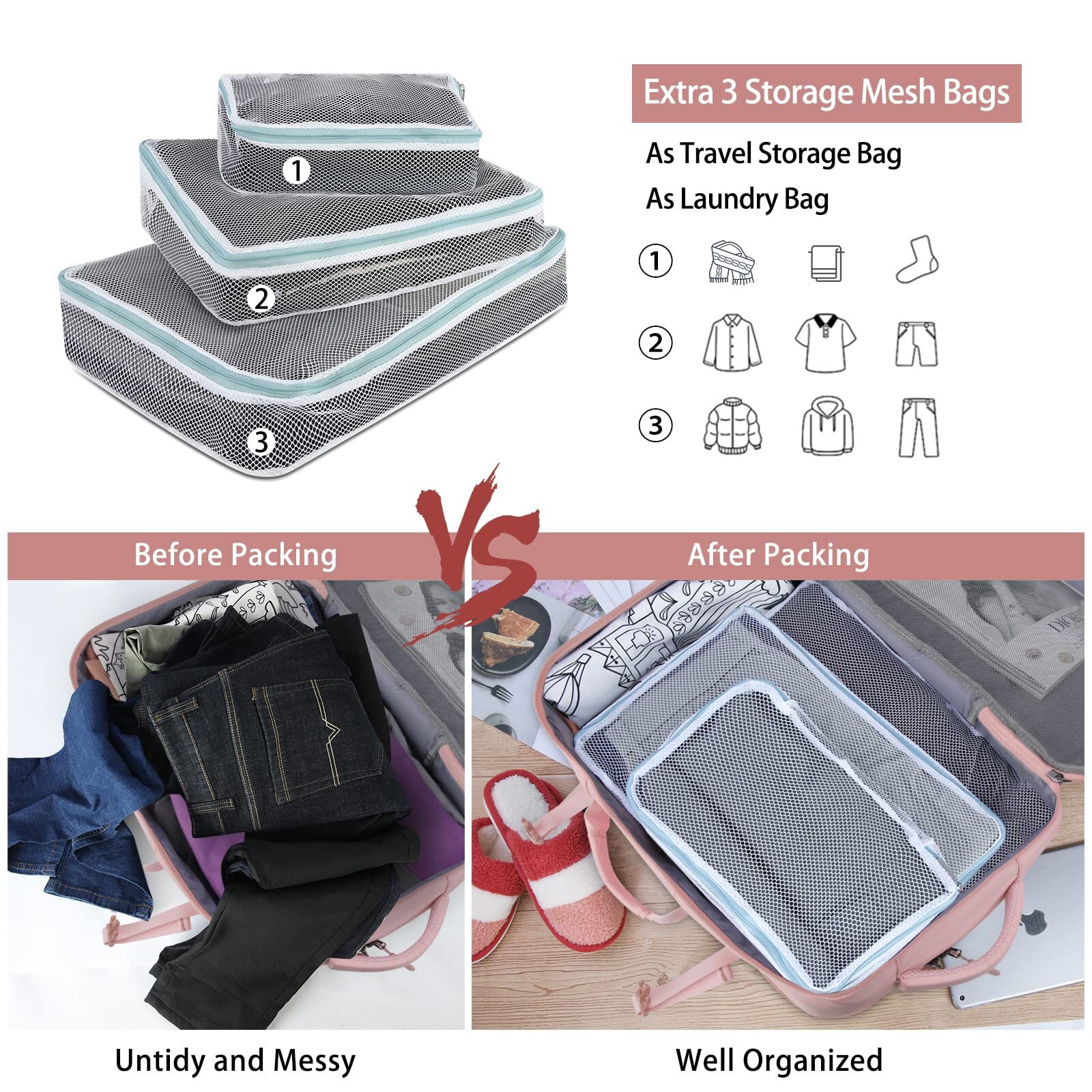 【Flight Approved Carry on Backpack】: Size of travel backpack: 20.47*13.38*7.87 inches. Capacity: 40L. This luggage backpack is meet the allowed maximum size of most IATA flights and also fits in the overhead compartment and the underseat in flight. The portable opening facilitates you to quickly pass the airport security check. It also has built-in elastic bands to keep your clothes from falling out. This travel backpack is great for flight travel, camping, hiking, college, etc. 【With 3 Storage Bags & Wet Pocket】: The carry on backpack comes with extra 3 storage bags that are great for organizing your clothes when packing for a trip. Full mesh design for clearly seeing items and easier to find them. It also can be as a laundry bag to protect your clothes from tangling. The travel backpack is equipped with a front wet pocket that is made of high-density waterproof material. It is large enough to store wet clothes or toiletries. 【Large Capacity & Well Organized】: The travel weekend backpack with many compartments is meet the needs of daily & trips. It has a spacious main compartment to store lots including 5 to 8 clothes, shoes, books, and so many other items. One laptop compartment holds laptops up to 17.3 inches. One wet pocket for toiletries and wet items. A front compartment with various pockets can store small items. One side pocket for easy access essentials like a water bottle or umbrella. 【Practical & Comfortable Design】: The handles are set on top and one side, which allows an easy switch between backpack and suitcase. The luggage belt on the back allows be slid over the luggage tube. The reflective strip on the back of the travel backpack makes it safe to travel at night. Breathable sponge mesh design on the backside and shoulder straps help for the air convection, ventilation, and heat elimination and help relieve the stress from your shoulder. 【Durable & Multipurpose】: The personal item travel bag is made of high-quality water-repellent fabric, lightweight, waterproof, and anti-wrinkle. Sturdy explosion-proof YKK zipper and upgraded reinforced stitching make it last longer. This stylish luggage backpack can be used as a laptop backpack, outdoor travel backpack, business backpack, college daypack. If you have any questions, please feel free to contact us, we will give you a satisfactory solution within 24 hours.