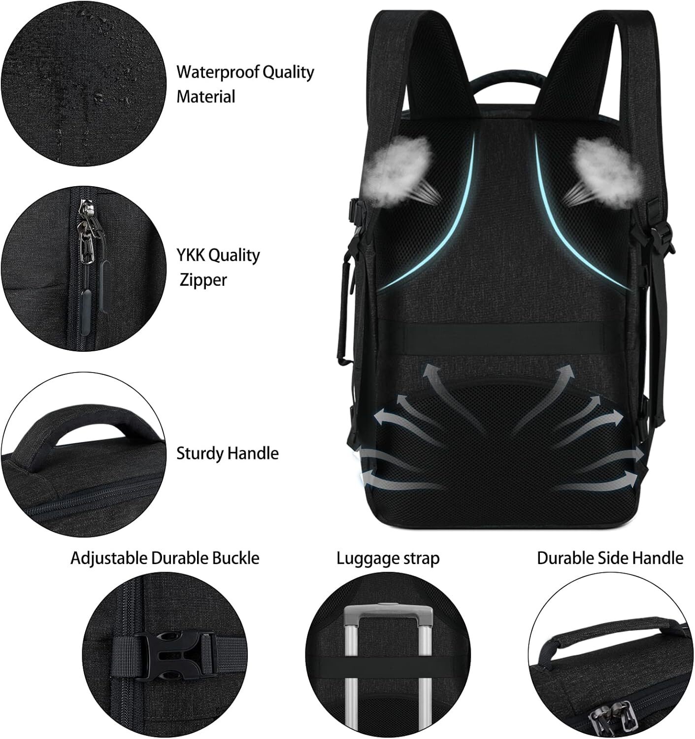 Travel Backpack Men Women 17 In Flight Approved Carry on Backpack Waterproof 【Flight Approved Carry on Backpack】: Size of travel backpack: 20.47*13.38*7.87 inches. Capacity: 40L. This luggage backpack is meet the allowed maximum size of most IATA flights and also fits in the overhead compartment and the underseat in flight. The portable opening facilitates you to quickly pass the airport security check. It also has built-in elastic bands to keep your clothes from falling out. This travel backpack is great for flight travel, camping, hiking, college, etc. 【With 3 Storage Bags & Wet Pocket】: The carry on backpack comes with extra 3 storage bags that are great for organizing your clothes when packing for a trip. Full mesh design for clearly seeing items and easier to find them. It also can be as a laundry bag to protect your clothes from tangling. The travel backpack is equipped with a front wet pocket that is made of high-density waterproof material. It is large enough to store wet clothes or toiletries. 【Large Capacity & Well Organized】: The travel weekend backpack with many compartments is meet the needs of daily & trips. It has a spacious main compartment to store lots including 5 to 8 clothes, shoes, books, and so many other items. One laptop compartment holds laptops up to 17.3 inches. One wet pocket for toiletries and wet items. A front compartment with various pockets can store small items. One side pocket for easy access essentials like a water bottle or umbrella. 【Practical & Comfortable Design】: The handles are set on top and one side, which allows an easy switch between backpack and suitcase. The luggage belt on the back allows be slid over the luggage tube. The reflective strip on the back of the travel backpack makes it safe to travel at night. Breathable sponge mesh design on the backside and shoulder straps help for the air convection, ventilation, and heat elimination and help relieve the stress from your shoulder. Product Description 40L Travel Backpack Carry On Backpack for Men Women 17 Inch Laptop Backpack This travel laptop backpack has multiple interior pockets that help you organize all your stuff to carry all essential items, such as clothes, iPad, umbrellas, books, bottles, tablet, laptop, etc. It is suitable for 3-7 days weekender or business trip, can be used as a carry-on flight bag. With water-repellent fabric, sturdy explosion-proof YKK zipper, upgraded reinforced stitching, it’s a high quality, durable, lightweight, well-made travel backpack and ideal choice for travel. Compared with other similar travel backpack, this travel backpack comes with extra 3 storage bags to make your item organized. It is great for organizing your clothes when packing for a trip. It also can be as a laundry bag to protect your clothes from tangling Multiple carrying options to offer you an easy trip. You can carry this carry on bag as a backpack or suitcase or fit on the luggage's handle. It is an ideal gift for men and women on valentine's day, anniversary, and birthday. Organized and Protect With extra 3 storage mesh bags are great for organizing your clothes when packing for a trip. It also can be as a laundry bag to protect your clothes from tangling, snagging. Great ideal for travel. Flight Approved Backpack Travel with a carry on size backpack can be easily placed in the aircraft carry-on luggage. You don’t worry about expensive checked bag fees or the airlines losing your luggage. Exterior Compression Straps The compression band design of the traveling backpack can reduce stress on the zippers and prevent the items from sloshing around. Large Capacity & Roomy Compartments Spacious Main Compartment The main compartment, comes with 3 storage bags, provides roomy space for clothes, books, power bank, travel accessories, and other necessities. Back Laptop Compartment A separate laptop compartment on the back of the bag. You can remove the laptop without getting into the main compartment. More convenient and safe. Fits for 15.6, 17, and up to 17.3 inch laptop. Front Wet Compartment The wet pocket of this travel backpack is made of high-density water-resistant material which is large enough for you to store wet clothes or toiletries. Front Organizer Compartment The front pocket with several front functional pockets, you can hold your small items perfectly, such as laptop accessories, phones, keys, pens, etc. SPECIFICATIONS Material : Water-resistant fabric Color: Black/Grey/Blue Weight:2.53 lbs Capacity: 40L Dimension: 20.47*13.38*7.87 inch Fit Laptop Size: 13 inch, 15.6 inch, 16 inch, 17 inch, 17.3inch Occasions: Airplane Travel, Vacation, Camping, College, Casual, Business, Shopping, Outdoor Hiking Camping Overnight, etc. Type Backpacks Age Range Description Adult Capacity Total 40 Liters Number Of Items 1 Product Dimensions 7.87 x 13.38 x 20.47 inches Country of Origin China Item Weight 2.44 pounds Units 1 Count Shipping Fast shipping is very important for us. Our standard US shipping service is FREE. Your order will be shipped within 5 business days upon full payment received. Your order will be delivered within 3-5 business days after the handling time. We are not responsible for undeliverable addresses. Returns and payment We offer a 30 days return policy from checkout winning date. FeedBack Your feedback very important to us, after you get your package and you are satisfied with our service please leave us positive feedback If you have any problem with your order / any questions please before leave any type of feedback For any questions, using eBay contact system Please visit our eBay store to check out other items for sale! Thank you for shopping at our store.