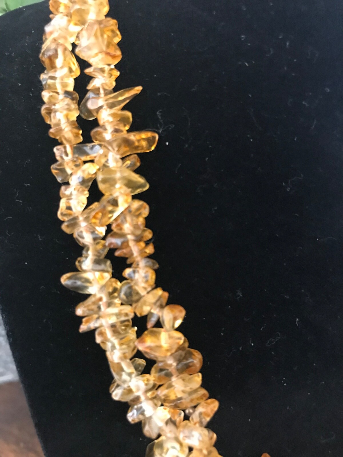 This vintage Carolee necklace features a double-stranded design with citrine-colored chip beads, giving it a unique and elegant look. The closure is toggle style engraved with Strength, Force, Fuerza, and the necklace is signed by the brand. Made of glass material, the necklace has a vintage feel from the 1970s-1980s and is crafted in the United States. With a 17-inch length, this gold-toned piece adds a touch of sophistication to any outfit with its beaded style.