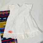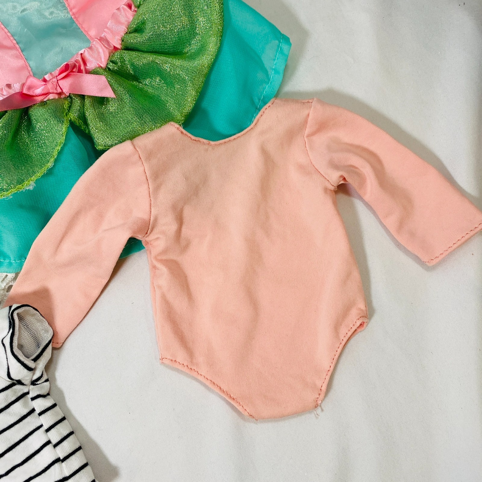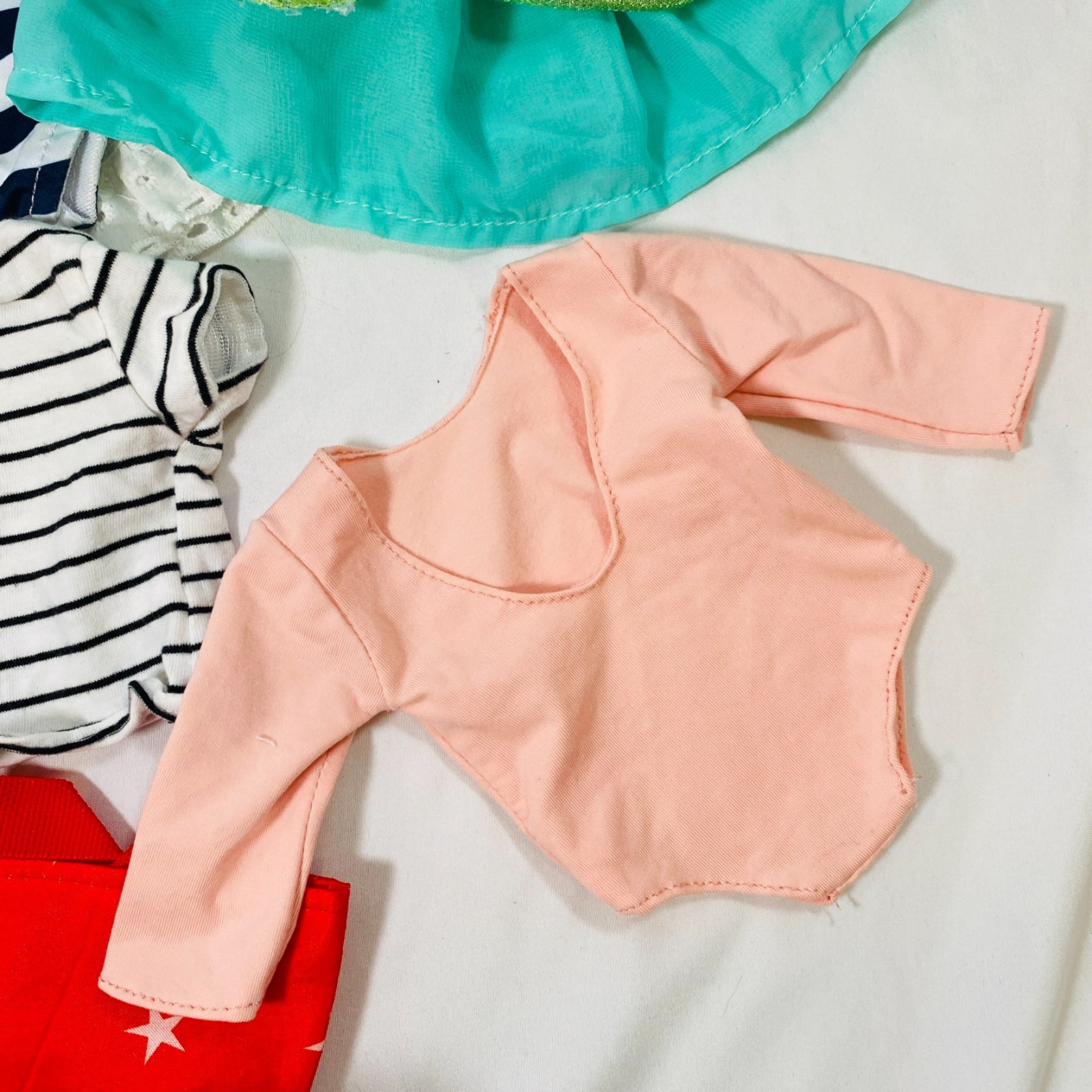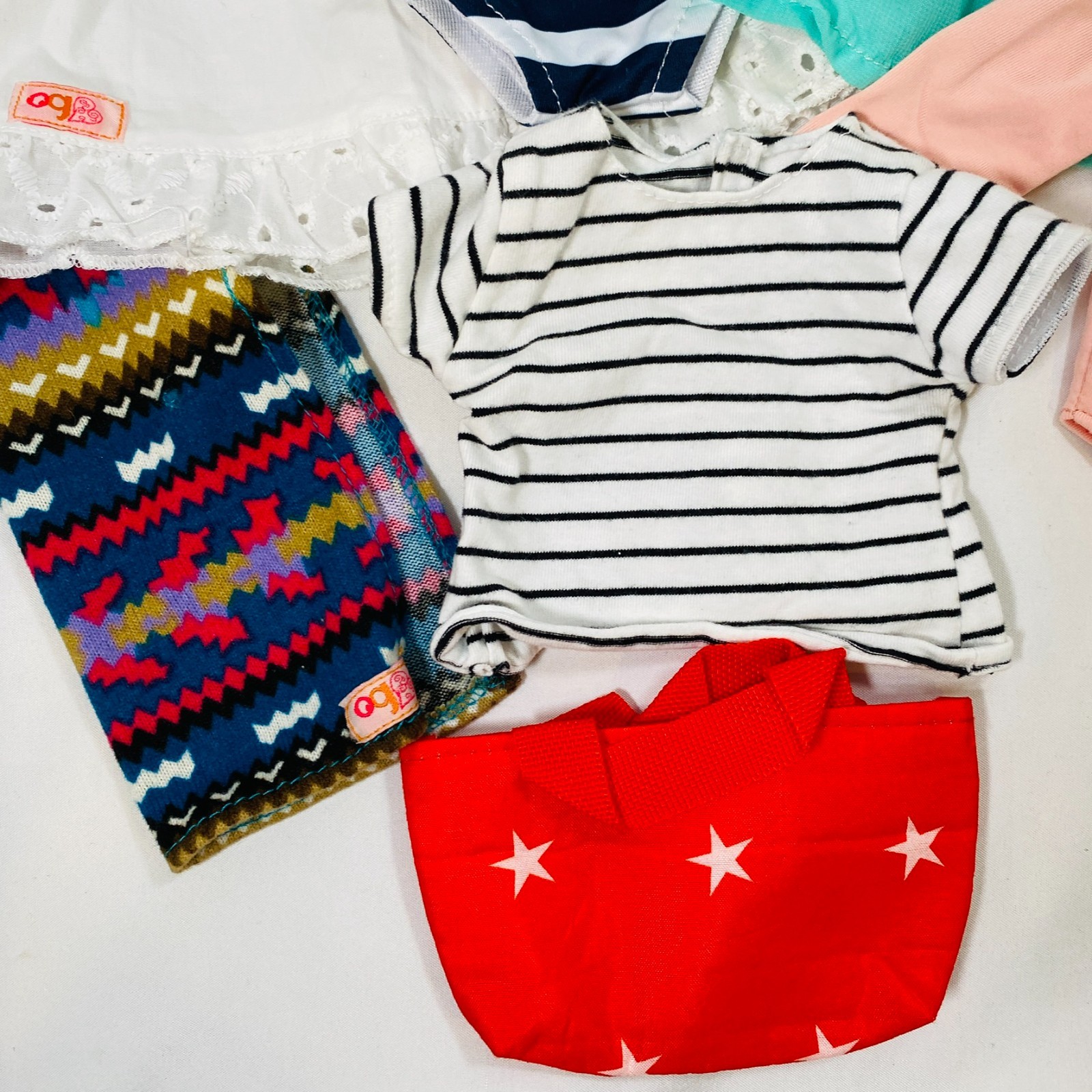 Set for 18" American Girl dolls or similar. All unbranded or Our Generation Brand. Includes White Eyelet-Trimmed Dress, Navy/White Striped Swimsuit, Pastel Leotard w/ Skirt, Peach Dance Leotard, White/Black Striped Skirt, Red Star Tote Bag, and Blanket. All pieces in gently played with condition, no stains or rips. Please see all pictures for exact cosmetic condition and other details, and ask any questions before purchasing. We are a husband and wife team with a growing family, and greatly appreciate your support of our small business. Please browse our eBay store for a variety of other American Girl items. We hope you enjoy this set!