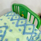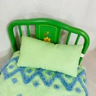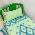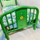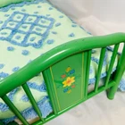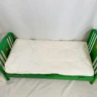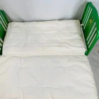 18" American Girl Doll Kit's Green Trundle Bed & Tufted Bedding Set. Original version, includes Green Metal Bed Frame with Fold-Out Trundle Support, White Mattress (folds for single doll), Tufted Bedspread, and Pillow. Just missing rug and throw pillow from the original set. In played with condition due to folding piece that supports trundle fold-out being broken. Original owner taped it together, which is a workable solution; I untaped it to inspect the damage and the actual metal brackets that hold it in are broken. Otherwise, everything else is sturdy and fits together correctly. Mattress has some discoloration or light watermarks that may wash out, I haven't tried. Paint on frame has some light scuffs/scratches. Quilt & Pillow are in great shape. Please see all pictures for exact cosmetic condition and other details, as they are part of the description as well, and ask any questions before purchasing. We are a husband and wife team with a growing family, and greatly appreciate your support of our small business. Please browse our eBay store for a variety of other American Girl items. We hope you enjoy this set!