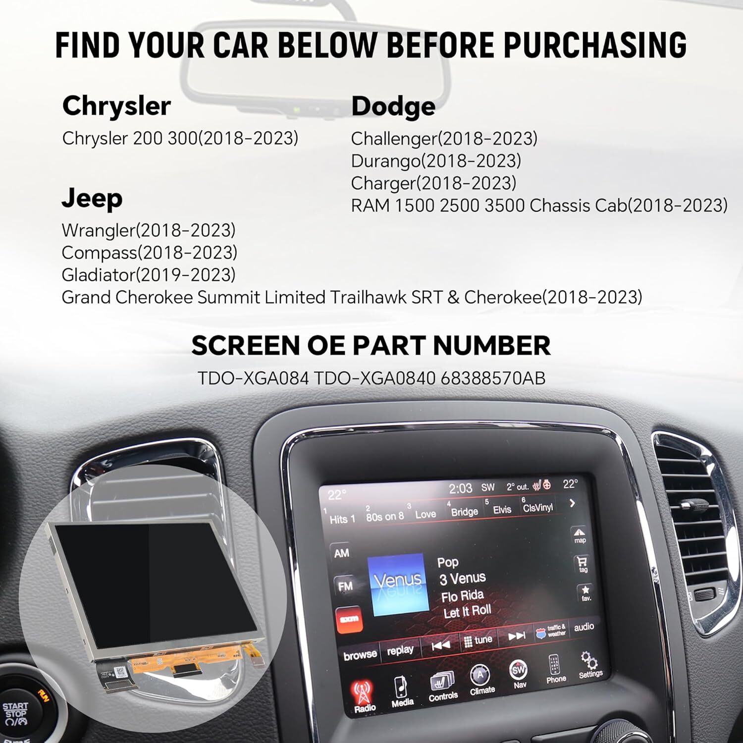 Store Categories Store Categories Fuel Injection Parts Interior Parts & Accessories Ignition Systems & Components Air & Fuel Delivery Parking Assistance Blowers & Fans Car & Truck Parts & Accessorie Lighting & Lamps Business & Industrial Home & Garden Consumer Electronics eBay Motors Other 18-22 Jeep Grand Cherokee 8.4" LCD Touch Screen Display Uconnect 4C UAQ MONITOR Product Description Features: That offers a superior fit and performance Guaranteed to look and function like the part your with from the factory Made using the finest materials and up-to-date technology Proven to offer the quality and reliability owners are accustomed to Engineered to deliver trouble-free installation with no modifications required Part Number: TDO-XGA0840J00001-V5 TDO-XGA0840J00001-V5 V4 V3 V2 V1 TDO-XGA084 LM1490A01-EFTM FTM84DC01-D Fitments: For 2018-2023 Challenger For 2018-2023 Durango For 2018-2023 Charger For 2018-2023 Wrangler For 2018-2023 Compass For 2019-2023 Gladiator For 2018-2023 R-a-m 1500 2500 3500 Chassis Cab For 2018-2023 Chrysl-e-r 200 300 For 2018-2023 Je-e-p Grand Cherokee Summit Limited Trailhawk SRT & Cherokee Fitments: For JEEP GRAND CHEROKEE 2018-2023 8.4" Uconnect Touch-Screen Radio For RAM 2018-20238.4”Uconnect Touch-Screen Radio PLEASE MAKE SURE YOUR DISPLAY LOOKS LIKE THIS ONE AND RIBBON CABLES MATCH Package included: 1PCS x 8.4" REPLACEMENT LCD DISPLAY TOUCH-SCREEN Uconnect Payment Policy Shipping Policy Returns Policy Payment Policy ▶PayPal payment is the preferred method of payment,we also accept payment via PayPal, DebitCard, Credit,Visa, MasterCard, Discover. ▶We will only ship to the confirmed PayPal shipping address given with the payment for fast and accurate shipment,Please keep the consistency of Paypal address and ebay address. ▶If you want to ship to other address, please change your PayPal shipping address before you make payment. ▶To avoid initiating an unpaid item claim, please pay within 7 days,or ebay will launch Unpaid Reminder agaist you and there will be bad record on your ebay account. Shipping Policy ▶All items will be shipped in 24 hours after receiving your payment and will ship by USPS First Class/ Priority Mail or UPS. We only ship to the confirmed address provided by PayPal.Before you pay, please make sure your address in PayPal matches the address you would like us to ship to. ▶If you want to chose another address, please leave us a message on ebay.Please check your shipping address carefully before checkout, it can't be changed if order completed. ▶For US customers, all items will be shipped out within 1-2 business days with cleared payment. Please included your phone number to the payment note for prompt and secure shipment. ▶Important Notice Transit Time Is Best Estimated But NOT Guaranteed As Transit Time Varies. Orders may be subject to import taxes, customs duties and fees levied by the destination country. Returns Policy ◆We offer 30 days return policy. Please contact us within 30 days t from the date you receive your order if you have any issues with the product or want return .Refund will be send after we got your resend package. ◆All returned items should be in the original packaging , return tracking information should be provided . ◆Buyer is responsible for return shipping cost due to the problem not caused by item quality itself . ◆It is our goal to provide our customer 100% satisfaction. ◆ Our warranty does not extend to any products that are physically damaged or that are not under normal operating conditions as a result of misuse or improper installation on the buyer/user's part. ◆ For all return products customers MUST contact us for the returning address. Products should be returned with original packages and must be returned in like-new condition with all accessories and packaging. Copyright © 2023 Dianxiaomi On Dec 24, 2025 at 03:21:46 PST, seller added the following information: