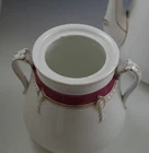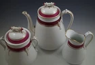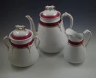 HELLO AND WELCOME TO MY STORE FOR SALE c.1870, UNMARKED BUT IT HAS BEEN ATTRIBUTED TO HAVILAND'S OLD WEDDING BAND- RING TEA SET, DECORATED WITH TWISTED ROPE DESIGN, BURGUNDY RED AND GOLD SET CONSISTS OF: 1 LARGE TEAPOT 9" HIGH AND 6.1/2" SPOUT TO HANDLE 1 BISCUIT JAR, MEASURES APPROX. 8" HIGH AND 6.1/2" HANDLE TO HANDLE AND 1 MILK PITCHER 5.1/2" HIGH POT HAD REPAIR BY THE TEA FILTER, PLEASE SEE PHOTOS, IT'S NOT REALLY NOTICEABLE, OVERALL GOOD ANTIQUE CONDITION THANK YOU FOR LOOKING I am a dedicated seller, I try describing my items the best I can. I ship quickly, wrap my items carefully. I guarantee authenticity of my items. thank You