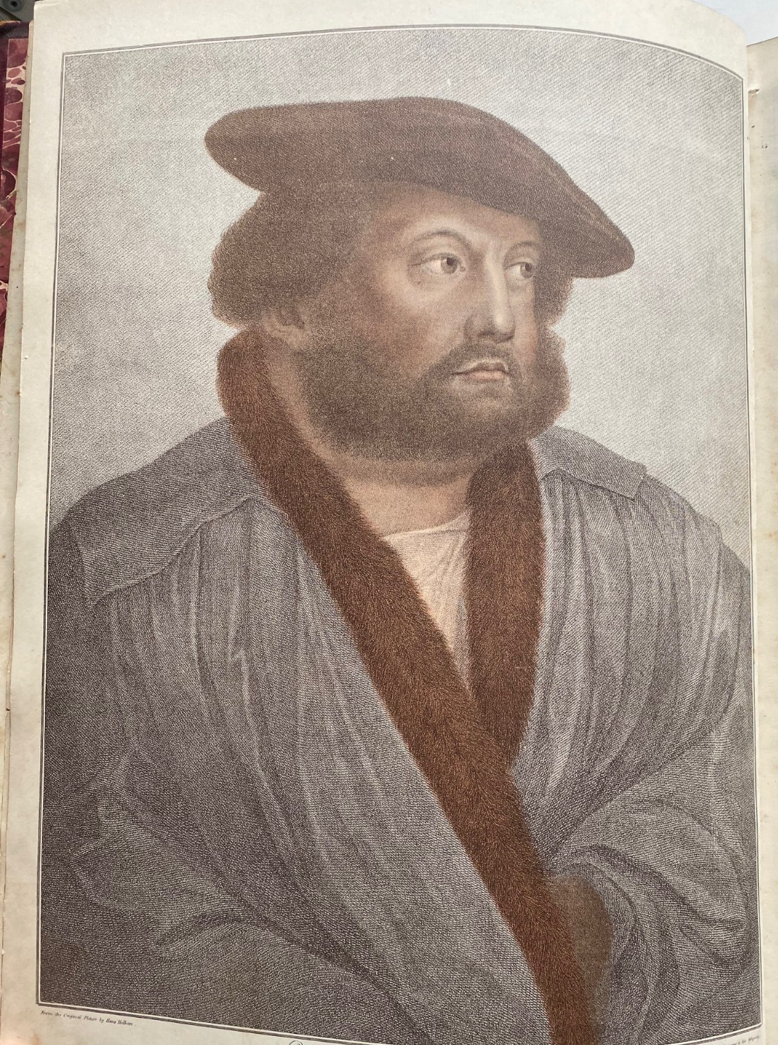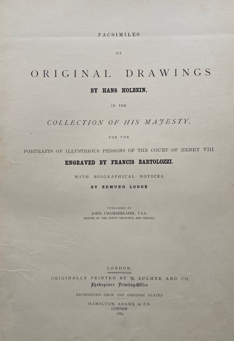 Express Shipping Worldwide is Free Facsimiles of Original Drawings by Hans Holbein in the Collection of His Majesty for the Portraits of Illustrious Persons of the Court of Henry VIII With 90 chromolithographs engraved by Francis Bortolozzi after Holbein, mostly colour portraits With biographical notices by Edmund Lodge Published by Hamilton, Adams Co., London, 1884 A monumental size volume, complete With all 90 plates present According to the publishing information, often this volume comes with 88 or 89 plates - this copy has the maximum number of 90 plates This volume is a fine art facsimile volume featuring reproductions of Hans Holbein the Younger’s celebrated Tudor-period portrait drawings There 90 colour chromolithograph plates, created by engraver Francis Bartolozzi after Holbein’s original life-size drawings in the Royal Collection. There are accompanying biographical and historical notices for each sitter, authored by Edmund Lodge, with editorial oversight by John Chamberlaine. The portraits depict members of Henry VIII’s court—including the King himself, his queens (such as Anne Boleyn), courtiers like Thomas More, Thomas Wyatt, and various nobles and functionaries. These are reproductions of Holbein’s preparatory drawings, known for their remarkable precision and observational realism. The accompanying texts provide historical context—offering lives, roles, and significance of each individual. In the publisher's original half-leather morocco-backed marbled boards, with six compartments to the spine, with titles, lines and decorations in gilt. All the edges of the pages is gilt. There is shelfwear and marks to the covers. There is a blank "tissue guard" leaf ahead of each plate of which one tissue guard has tears. The gutter is exposed in a few places however this does not impact at all on the integrity of the binding. There is some foxing to the first and last three leaves and then very light occasional foxing to perhaps three or four leaves only. There are no previous owners' names or inscriptions. The plates are bright, fresh and crisp. There are no missing, stained, creased or loose pages. The spine and binding are solid. It is complete and original. Measures a massive 30cm x 38cm x 6.5cm and weighs a significant 5.1kgs unpacked. EXPRESS SHIPPING AND HANDLING is Free Worldwide All items are securely and well packed. Thank you for viewing my item.