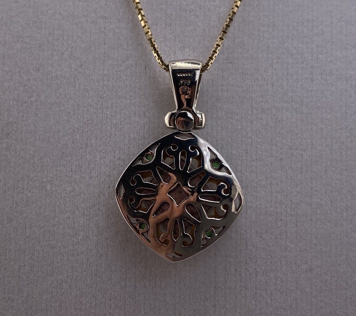 Beautiful pendant exactly as described. Perfectly matches the earrings I have. Wish the bail was a little larger as I can only slide a thin chain with a ring hook through the bail opening. Item was well packaged and shipped promptly from the authenticator. Very pleased with this purchase! Thank you!