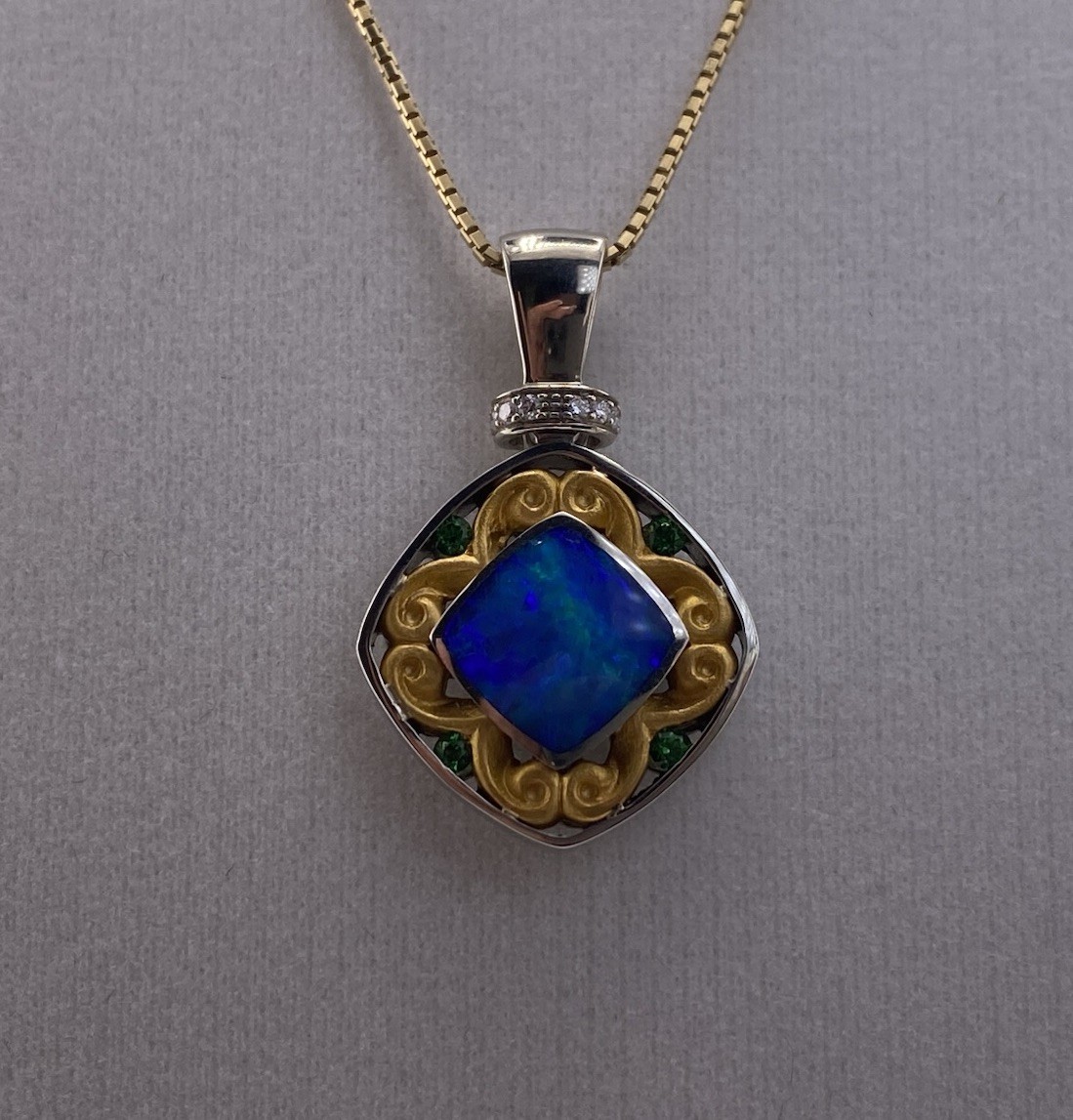 This stunning pendant is crafted from 18K white gold and features a beautiful opal stone with diamond and emerald accents. The intricate design and high-quality materials make this piece perfect for any occasion and a great addition to any jewelry collection. Whether you're looking to treat yourself or surprise a loved one, this pendant is sure to impress. High 1,4 in Width 0,8 in Weight 8 grams Please note that chain is not included with the purchase of pendant.