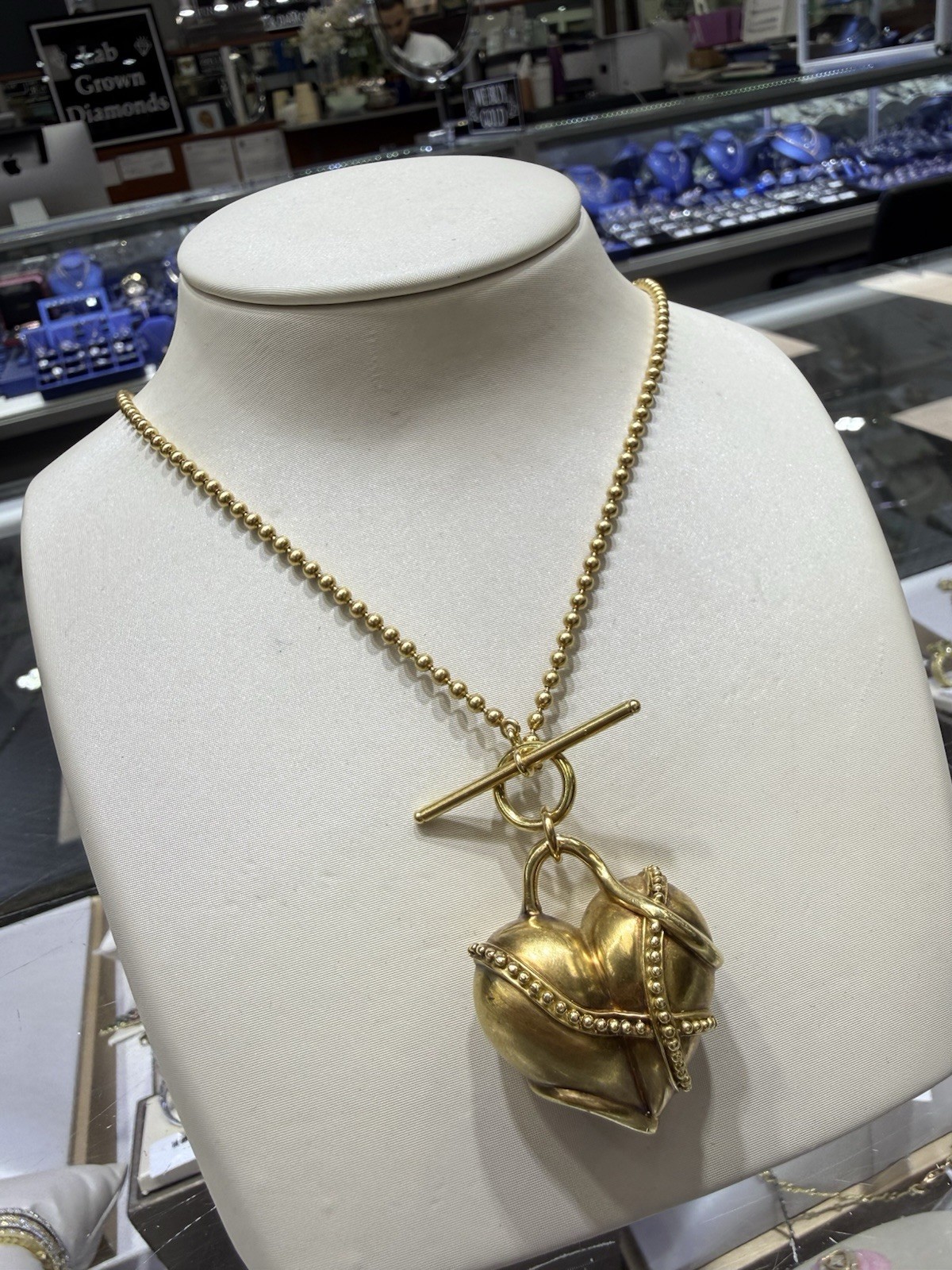 Beautiful and timeless 18KT yellow gold solid heart pendant necklace paired with a matching ball chain. The smooth, polished heart design offers a bold yet classic look, making it perfect for everyday wear or a meaningful gift. Crafted in solid 18KT gold, this piece has a substantial, high-quality feel and elegant shine that stands out while remaining versatile. Details: • Metal: Solid 18KT Yellow Gold • Pendant: Solid Heart • Chain Style: Ball Chain • Length: 17 inches • Condition: Pre-owned – Excellent condition • Shipping: FREE SHIPPING