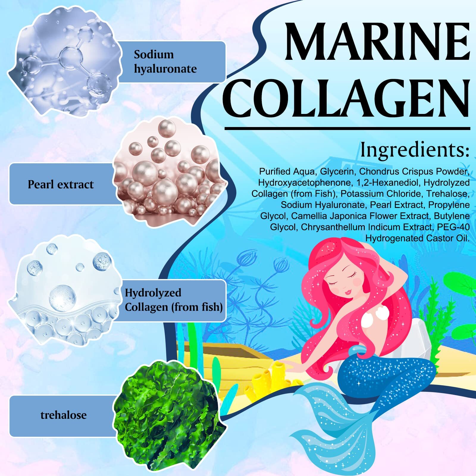 Under Eye Mask (18 Pairs) - Pearl Under Eye Patches, Natural Marine Collagen RESPONSIBLE Our natural ingredients areresponsibly sourced andconsciously developed &manufactured.t's just oneof the many ways we'regiving back to our planet NO HARSHCHEMICALS We carefully monitor how everyingredient will impact marine life.All of our formulas & packagingare recyclable or compostablemaking a better world. Applicable People: 1. Eye skin aging, relaxation, fine lines and other defects. 2. Long-term facing the computer office workers. 3. Eye skin very dry caused by staying in air-conditioned rooms for a long time. 4. Long time watching TV, eye fatigue. 5. Lack of sleep, living without the law who often stay up all night. Product Features: 1. Effectively revising damage of stay up all night and signs of aging. It could accelerate metabolism and revitalize the eye skin, remove wrinkles and fine lines. 2. Provide moistures for a long-lasting hydration to your skincare routine, reduces the appearance of puffiness. 3. Stimulates skin rejuvenation, help soothe the eye bags, firm and brighten the look of eye Features Your Under Eye Skincare - Eyes are the first thing people notice. Pearl masks may lift & firm dull skin with a protective effect helps prevent your skin from sagging. Feel confident and look your best, refreshed, awake, youthful, and brightened by adding these Pearl under eyes patchesinto your daily self-care routine. Puffy Eyes and Dark Circles Treatment: We premium Pearl under eye patches are highly effective eye skin care treatments that will quickly work against skin aging, flat wrinkles & fine lines, eliminate dark circles, remove puffiness, and speed up the cell and collagen rejuvenation. Easy to Use - Be a winner with top-quality eye gels. stay confident and look your best. Cool before use, and apply to clean dry area under the eyes. Leave on for 5-15 minutes for perfect results. High-end beauty will make you feel refreshed, awake & youthful. Premium Under Eye Patches For Men & Women: Whether you want to look 10 years younger, move on from having panda eyes or to simply remove puffiness for an event, the Pearl Eye Mask is here to your rescue.Best part is, even men can benefit from using these under eye gel patches regularly. Our Pearl eye-shaped hydrogels makes more reach areas around the eye for more concentrated care Fast and Free Shipping You're already purchasing the item. Why pay additional for shipping, especially slow shipping? We get your order shipped out within 1-business day and delivered to your doorstep as quickly as possible. Competitive Pricing With our dynamic pricing model, our prices are always competitive. Our prices are some of the lowest that you will find on the internet. Rest assured that you're getting a good deal when purchasing with us.