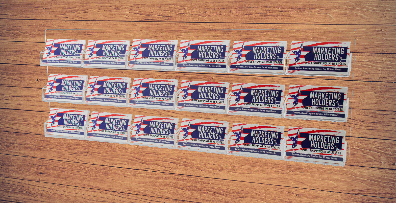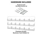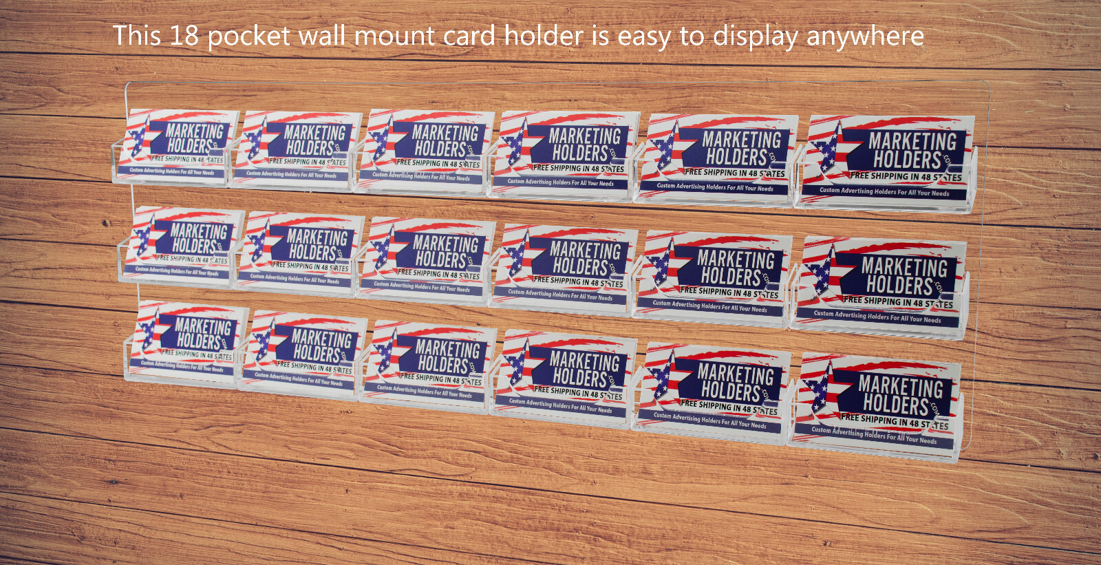 6 Pack of 18 Pocket Gift Card Retail Holder Card Display Contact Wall Mount Premium Product Features: Holds 3.5”W x 2”H standard sized business cards, appointment, membership, gift or rewards cards Pocket Dimensions: 3.5”W x 2"H x .75”D Pocket Capacity: 50 standard business cards or 30 gift cards Overall Dimensions: 24"W x 8.25"H x 1"D Perfect space saving multi pocket wall mount display holder with pre drilled holes and hanging hardware This large capacity eighteen pocket space saving wall mount business card holder provides a sturdy display for business, gift or appointment cards that complements any decor. These multi slot card racks are great space savers and help you keep counters free and clear of clutter. Looking for a convenient way to distribute multiple sets of cards in one convenient card organizer rack? Business card holders make spreading the word on the multiple sets of cards simple and easy to access and still appear professional. Just one holder to display multiple sets of printed material and help keep the clutter to a minimum. The appointment card display rack has a design that makes it easy for clients and potential customers to take one. Each pocket can hold up to 50 standard business cards so you will not have to fill them that often. This gift card showcase display is made with acrylic plastic material and made right here in the USA. The wall card rack provides long-term durability in addition to keeping your 3.5 inch by 2 inch printed material neatly in the holder, and can be easily placed on any wall by exits or entrances. We have designed these to display several sets of business cards and can be conveniently placed on walls or anywhere you want to leave your calling cards for the taking. These card holders come pre-drilled for easy hanging and includes hardware. All sizes are approximate Under no circumstances is Marketing Holders responsible for any actions involving hanging products using self purchased or provided hardware. It is up to the purchaser to make sure they are using the hanging hardware correctly. We will also not be responsible for the product if it cracks during the hanging process or if it falls and breaks. Return Policy 30 Day Return Policy: By purchasing our product you are agreeing to our return policy, so please read! Perfect returns (NO used merchandise) on stock items are accepted within 30 days of delivery. Any visual appearance that the product is used will result in 00 refund. All returns are subject to a 20% inspection, re-boxing and restocking fee. All returns must be repacked and returned in their original packaging for protection. (MUST return on pallet if received on Pallet) Packages being returned should be insured by you for your protection No credits are issued on shipping costs. Absolutely no returns accepted on custom order displays, including orders with custom text, imprinting or graphics