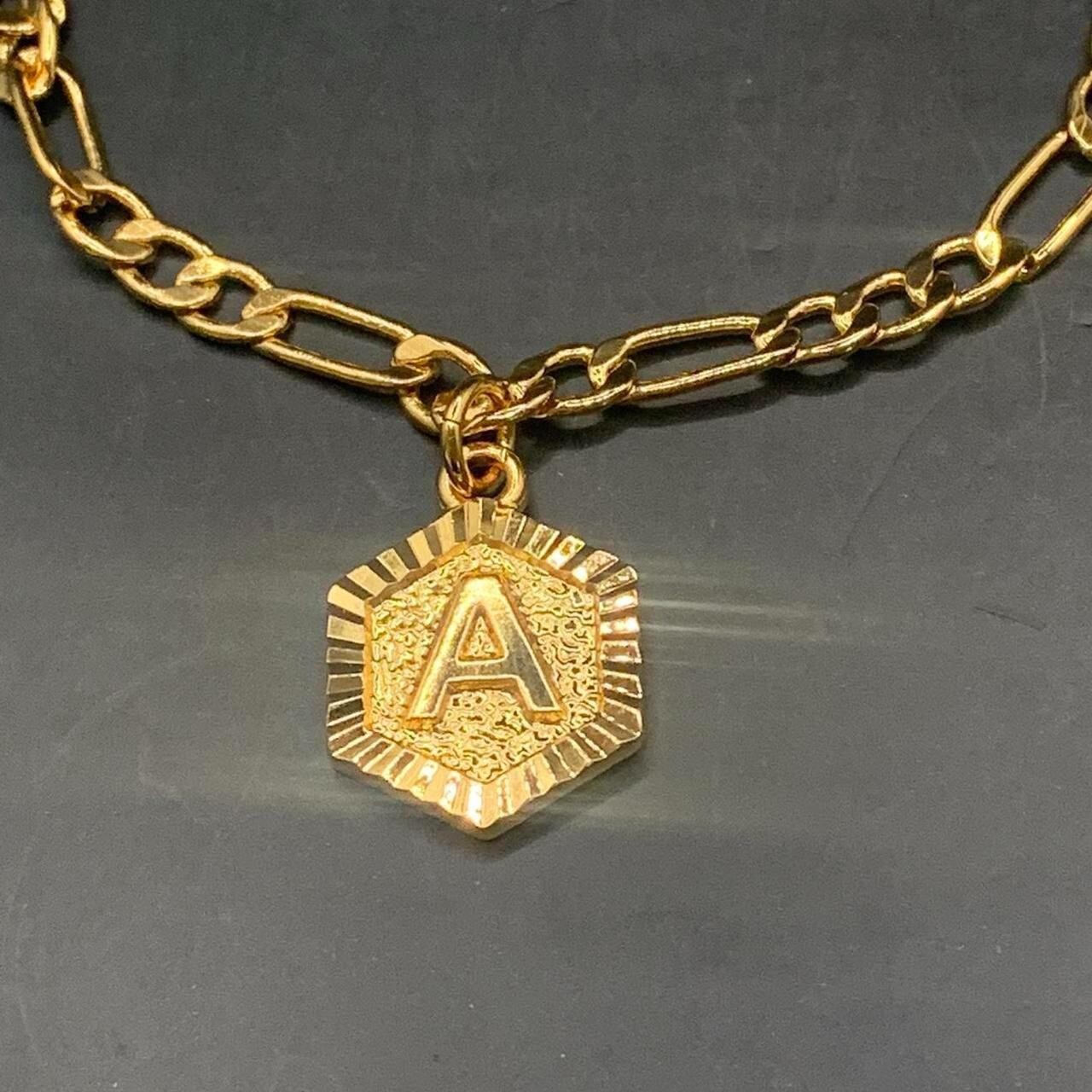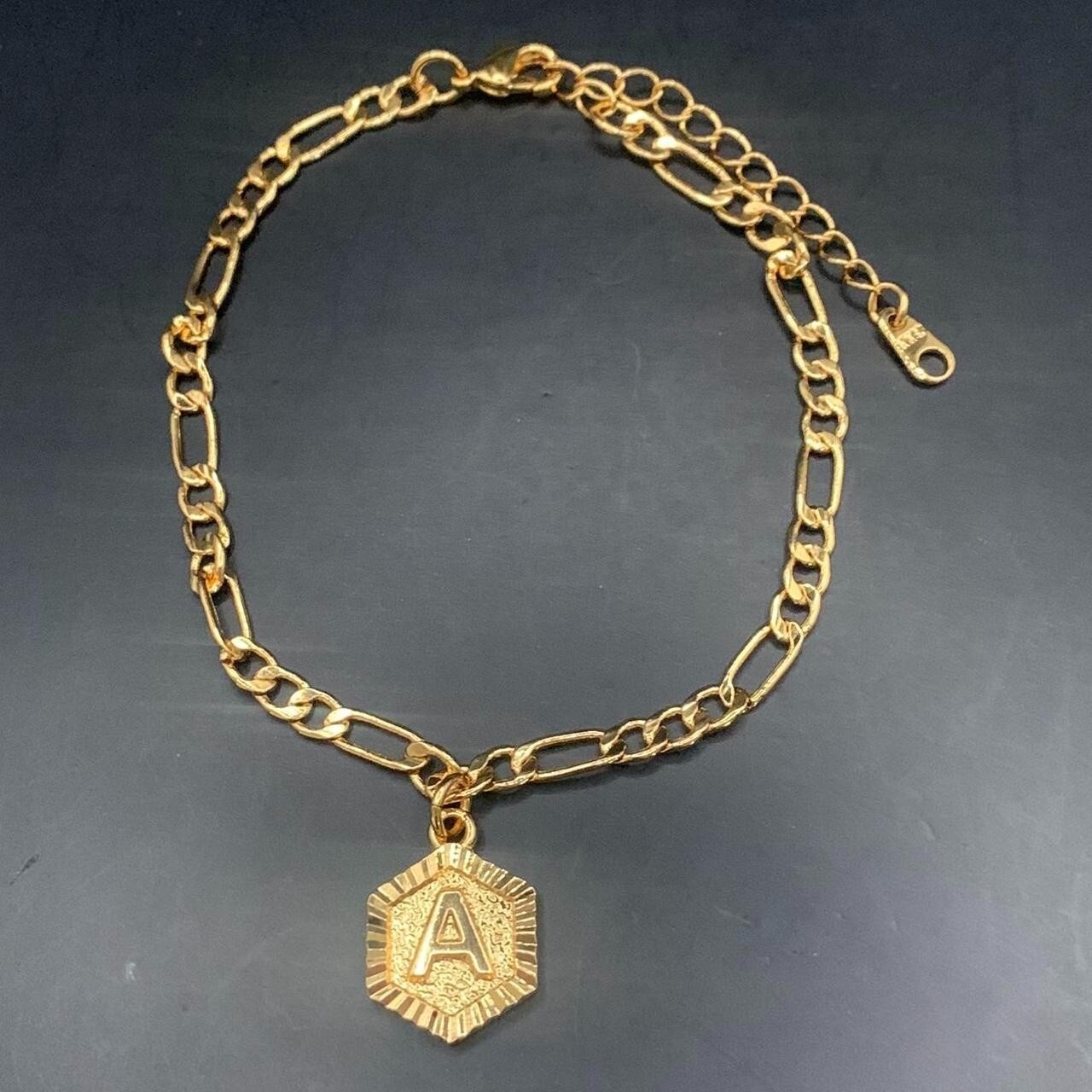 Initial letter A Hexagonal Charm 18ct Gold Plated figaro chain anklet -Other Initials Available Measurement 8.5- 10.5 inches When fully extended Charm 1.7mm height 1.5 mm width 18KGP stamped ~ 5 layers of plating High polished for shine Nickel Lead Cadmium Free hypoallergenic Can be worn as a bracelet for larger wrists To keep your jewellery in top condition, keep jewellery dry, be careful with fragrances, apply lotions before jewellery, store correctly and keep out direct sunlight - any further guidance please ask