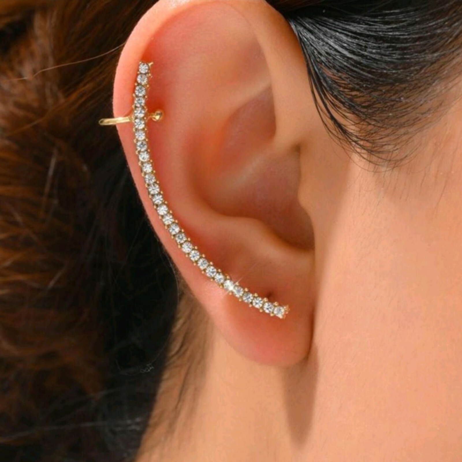 Add a celestial touch to your style with this 18k gold-plated crescent moon ear wrap, a perfect blend of sweet charm and edgy elegance. Embellished with sparkling cubic zirconia, this statement piece wraps around your ear like moonlight dancing on water. Whether you're heading to a vacation party, celebrating a graduation, or simply elevating your everyday look, this ear wrap is your ticket to effortless glam. Lightweight and versatile, it’s designed for comfort and maximum impact. Why settle for ordinary? Channel your inner moon goddess and make every outfit unforgettable—grab yours today!