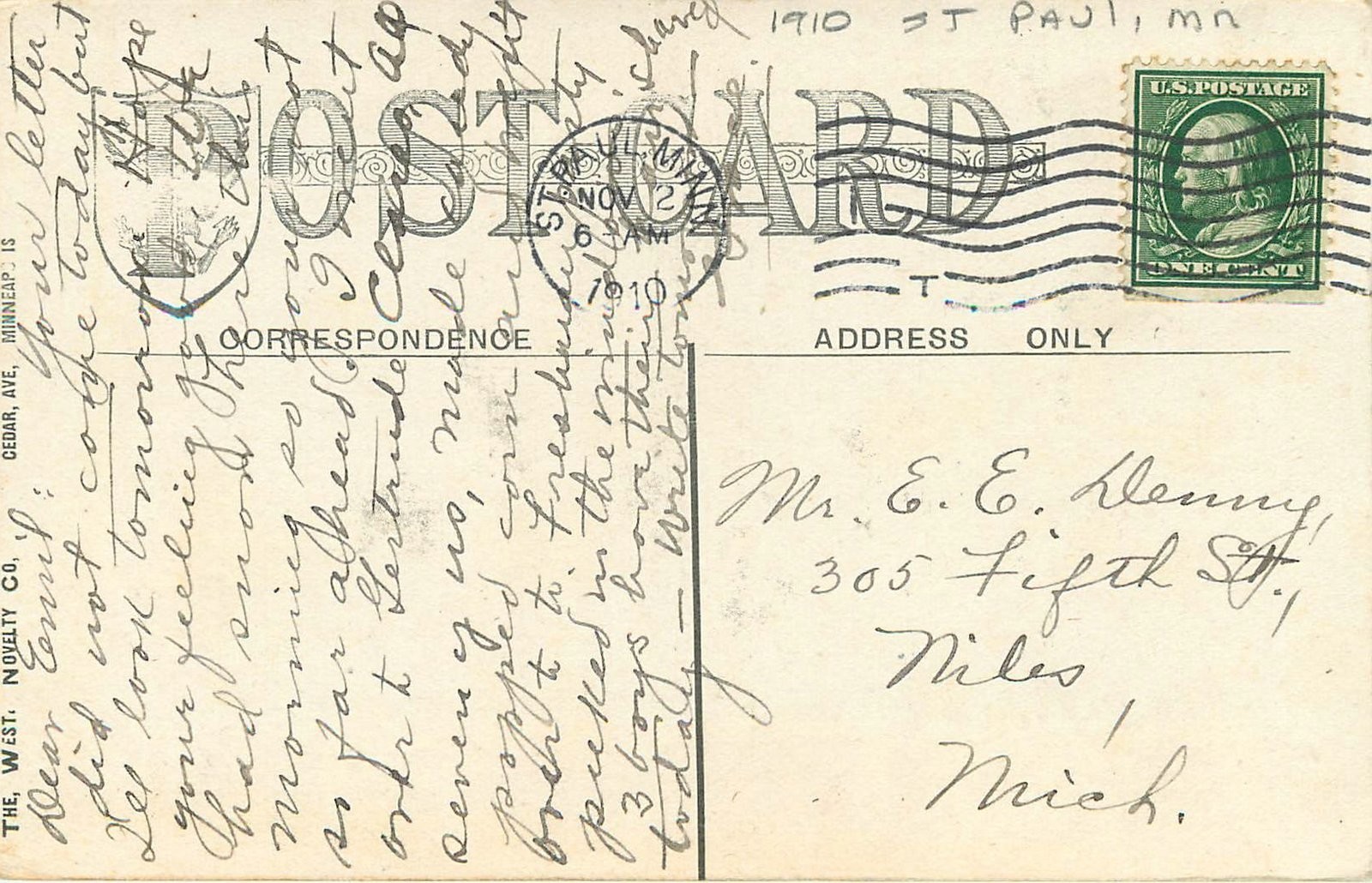 A Vintage postcard as described in title, additional info is below--rounded corners, surface damage Publisher-photographer--Artist---West Novelty CO card #----- no