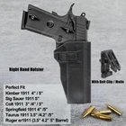 High Quality Military & Police Grade Polymer OWB Holster Specially Designed For Fast Draw During Duty Or Shooting Competition. Weapon Compatibility - Outside Waistband Tactical H olster for Non-Railed Versions of 1911 Models (For 9mm, .40 only). Holster fit 1911 Holster fit Dan Wesson Dan Wesson Specialist 5" 9mm Luger Dan Wesson Guardian 4.25" 9mm Luger 1911 Holster fit Ed Brown Ed Brown Special Forces 5" 9mm Luger Ed Brown Kobra Carry 4.25" 9mm Luger 1911 Holster fit Kimber Kimber 1911 5" 9mm Luger Kimber 1911 Pro 4" 9mm Luger Kimber Custom II 5" .40 S&W Kimber Pro Carry II 4" .40 S&W 1911 Holst er fit Nighthawk Custom Nighthawk Custom Talon 5" 9mm Luger 1911 Holste r fit Rock Island Armory (Armscor) Rock Island Armory 1911 Ultra FS 5" 9mm Luger Rock Island Armory 1911 FS Tactical 5" .40 S&W 1911 Hols ter fit Springfield Springfield 1911 EMP Champion 4" 9mm Luger Springfield 1911 Loaded 5" 9mm Luger Springfield Armory 1911 Loaded 5" .40 S&W Springfield Armory 1911 Loaded Target 5" .40 S&W 1911 Hols ter f it STI International (Staccato) STI Trojan 5" . 9mm Luger 1911 Hols ter fit Taurus Taurus 1911 5" 9mm Luger Taurus 1911 Commander 4.2" 9mm Luger 1911 Holste r fit Walther Walther Colt 1911 A1 5" .22 LR 1911 Holste r fit Wilson Combat Wilson Combat CQB 5" 9mm Luger ( I t perfect fit the 1911 gun without Optic Mount Mini Sight a bove on the end of the barrel , but also without laser and embedded chassis, and flashlight style ) Ease And Comfort Push side buttons to achieve the fast opening and closing, unique design allows for belt carrying or vest carrying, perfectly used by duty holsters, uniformed law enforcement officers, security personnel, military personnel, private persons, and shooting sports holsters. And it fits closer to the body which can achieve better concealment under clothes. High S afety Secure Level II Retention - Auto-locking system restrain pistol in the holster to ensure ultimate safety, activate the release by pressing the button with the index finger to achieve gun access Adjustable Easily set Holster 360 degrees to your desire position with Allen key, compatible belt width up to 2 inch Tough & Durable Material Custom-molded body made of polymer stronger than leather that will wear out, adapt to every bad environment In the Package: · 1*Holster with Paddle Attachment · 1*Allen Key Shipping: Ships same day or next except Sundays and Holidays ! Free shipping! Ship by USPS First Class Package. 100% MONEY BACK GUARANTEE. Any question please be free to contact with us First .Thanks!