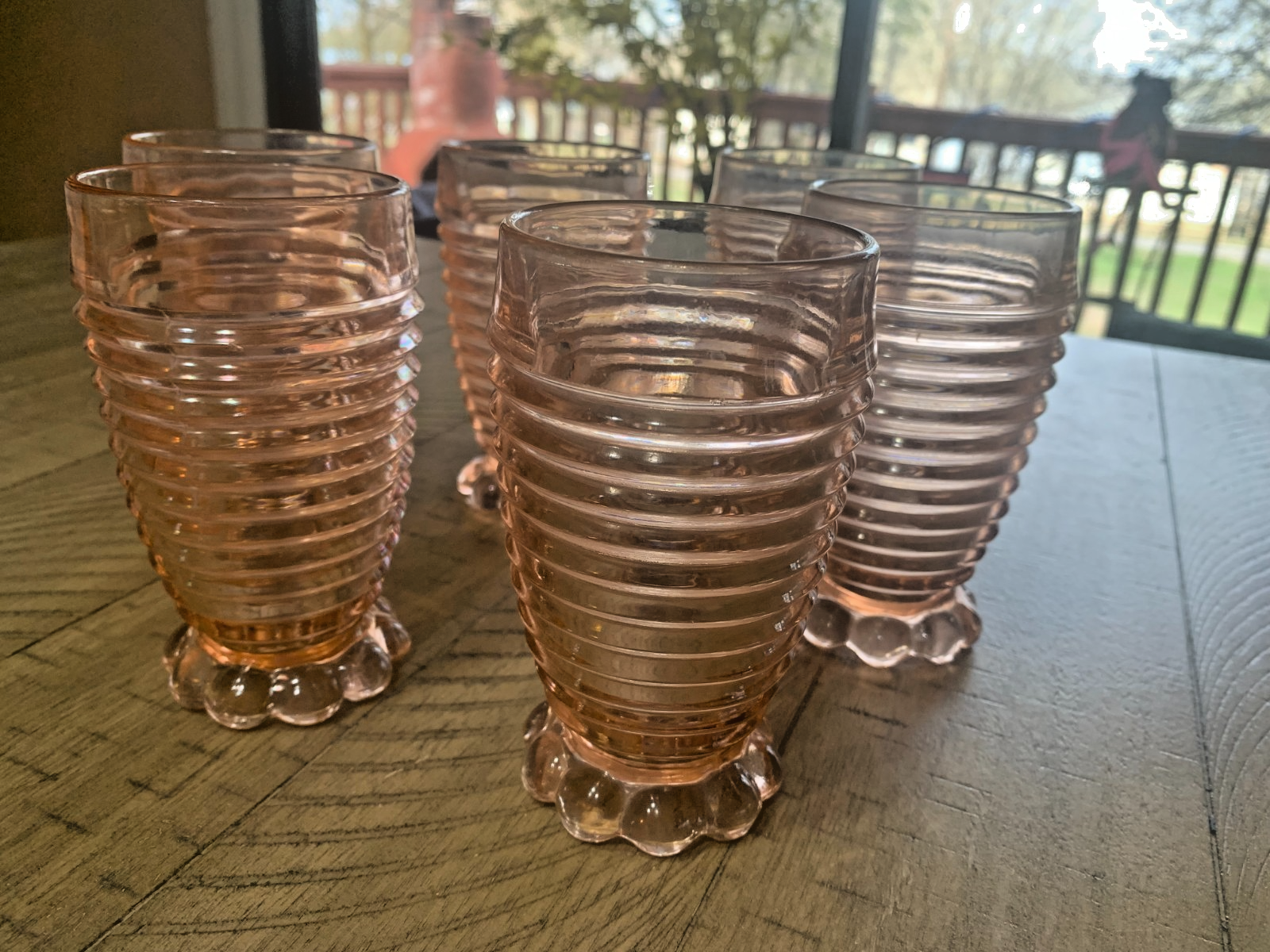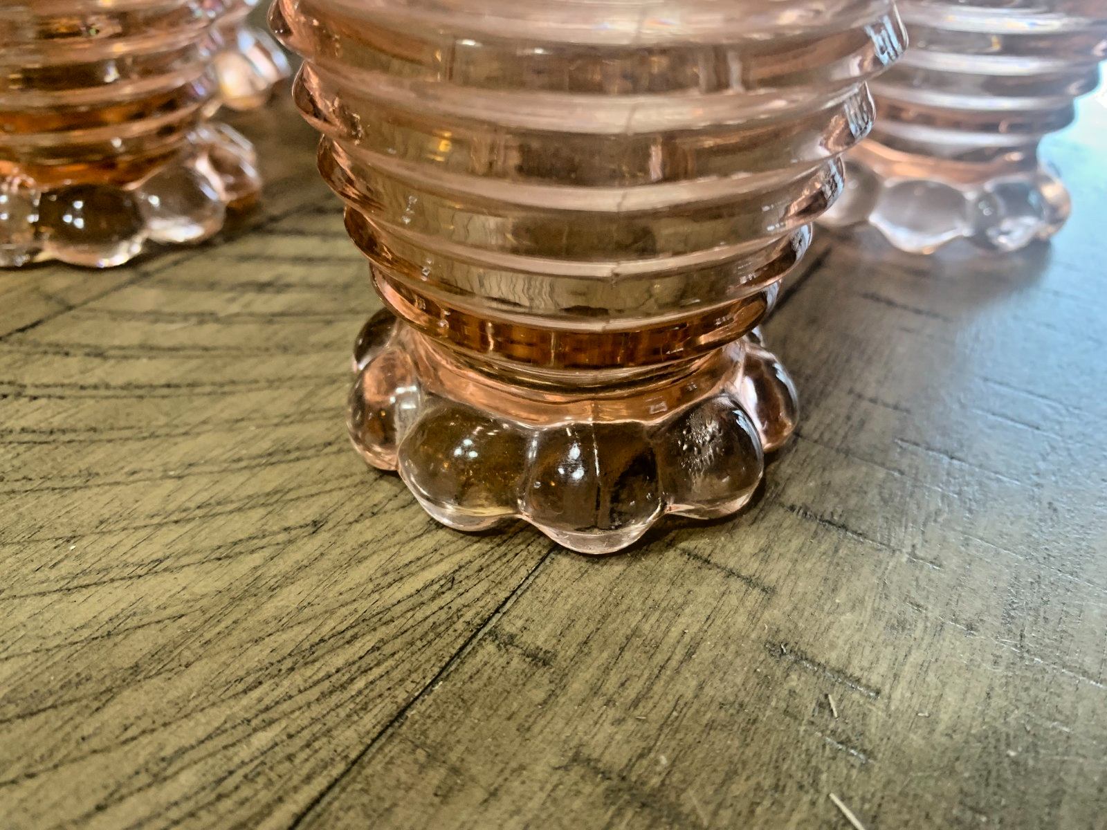 These,highly collectible, Anchor Hocking "Manhattan" 10 ounce, pink depression glass tumblers are a classic example of Art Deco design from the late Depression era. Produced by the Anchor Hocking Glass Company in the United States primarily between 1938 and 1943, the Manhattan pattern is celebrated for its distinctive horizontal concentric ribs and unique "bubble" footed base. While many depression glass patterns were delicate and ornate, Manhattan stood out with its heavier, machine-made construction and modern, geometric aesthetic that remains popular with collectors today. The "pink" color of this line is often described as a soft, pale, or peach-toned pink, which was more difficult to produce than the common clear (crystal) version, making pink pieces like this 10 oz tumbler more sought after by enthusiasts. It is important for collectors to note that Anchor Hocking later released a similar look-alike pattern in the 1980s called "Park Avenue," but the original Manhattan pieces, like this one, are easily identified by their characteristic bubble foot, whereas the later reproductions feature a plain base. While a few pieces show slight signs of their nearly 90-year history, they remain a stunning and functional addition to any Art Deco collection. Even after nearly 90 years, they are in good condition. FREE SHIPPING!