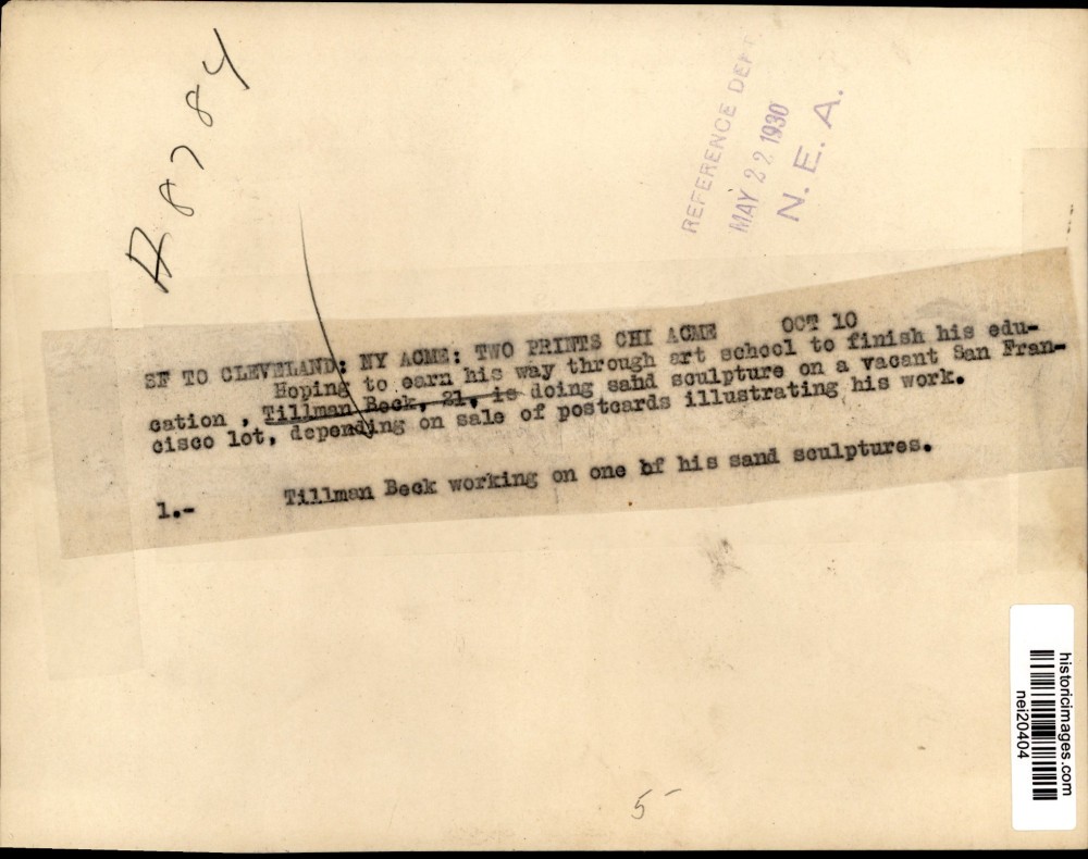 ebay template Note: Please study the images carefully to determine the condition of this vintage photograph, as it may not be in perfect condition. It may contain wrinkles, cracks, and possibly even tears due to its age and how it was handled before it got to us. A scanner may interpret colors and contrast differently than human eyes will, so it is possible that the actual photograph may be slightly darker or lighter in person. This vintage photograph is offered for sale as a collectible item and conveys no transfer of copyright. 1930 Press Photo Sculptor Tillman Beck working on sand sculpture, California This is an original press photo. Hoping to earn his way through art school to finish his education , 21, is doing sand sculpture on a vacant San Francisco lot, depending on sale of postcards illustrating his work. Tillman Beck woking on one of his sand sculptures (California)Photo measures 8.5 x 6.5inches. Photo is dated 05-22-1930. PHOTO FRONT PHOTO BACK Historic Images Part Number: nei20404 Sell Smarter with Kyozou. Inventory and Ecommerce Management