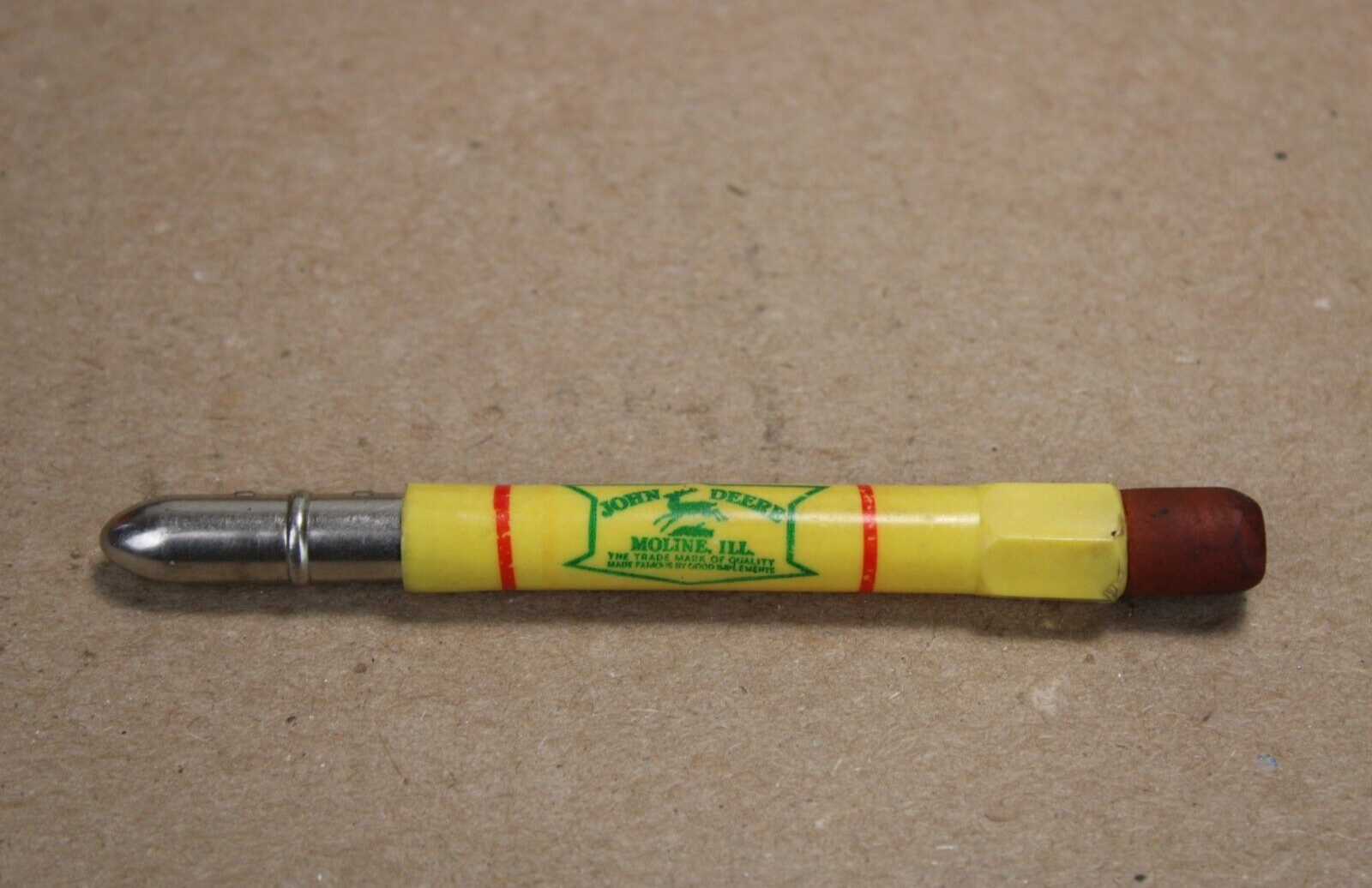THE MORE YOU BUY---THE MORE YOU SAVE ON SHIPPING-- USPS POSTAL RATES HAVE WENT UP AGAIN SO I HAVE TO CHARGE MORE FOR SHIPPING......... I COMBINE SHIPPING TO SAVE THE BUYER MONEY....PLEASE WAIT TO PAY UNTIL ALL THE AUCTIONS ARE OVER AND I WILL SEND YOU A COMBINED INVOICE. ..... Check out the photos of all the other old oil cans that I currently have on ebay. This bullet pencil is in nice shape and dates from 1937 . It is an old original with no touch ups or repairs. Not 100% mint (nothing is to me) but extra nice as you can see. Photos show all sides....it could use a good cleaning and shows wear. Please look at all photos before bidding. Some imperfections but still a nice old John Deere item. Photos show condition. It's an old one and it's GUARANTEED authentic. I DO NOT sell reproductions Please use the zoom and look closely at each photo to get a sure fire read of the condition before bidding. . PAYMENT EXPECTED WITHIN 10 DAYS OF AUCTIONS END. God Bless & Happy Bidding I SELL OLD A DVERTISING WHICH MOST ITEMS HAVE BEEN USED AND ARE IN USED CONDITION. I HAVE BEEN IN THE ANTIQUE ADVERTISING BUSINESS FOR OVER 30 YEARS AND I HAVE NEVER SEEN AN ABSOLUTE MINT ITEM THAT HAS BEEN USED BUT I HAVE SEEN A LOT OF STUFF THAT HAS BEEN USED VERY LITTLE THAT IS IN GREAT SHAPE AND WELL TAKEN CARE OF. LOOK CLOSELY AT MY PICTURES AND PLEASE, PLEASE ASK QUESTIONS BEFORE BIDDING.