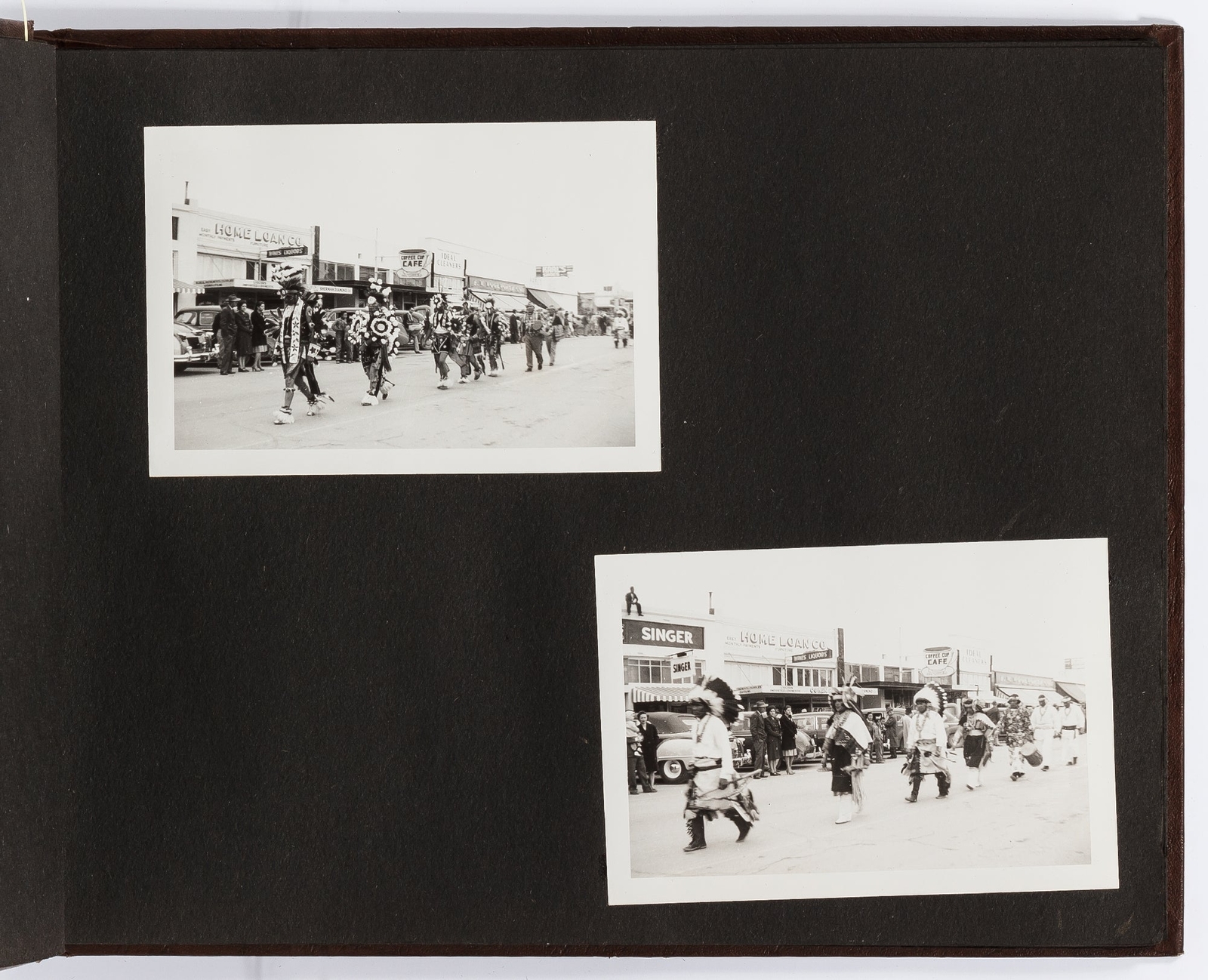 [Photo Album]: "Indian Celebration" Title: [Photo Album]: "Indian Celebration" Publication: Mesa, Arizona: 1947 Description: Softcover. Oblong quarto measuring 12" x 9". String-tied brown leather over stiff paper boards with "photographs" stamped in gilt on the front board. Contains 35 black and white gelatin silver photographs measuring around 3.5" x 5" with some captions. Near fine album with fine photographs. A photo album detailing an "Indian Celebration" in Mesa Arizona in 1947. The album beings with a cut out from the program of a Native American in traditional dress with "Indian Celebration Dec. 4-5-6-7 Mesa Arizona" underneath. Following this is a clipping which reads, "Husky Mark Vest of the Maricopa tribe, standing well over six feet, will be one of the hundreds of performers to be seen each night through Sunday at the first National Indian Celebration in Mesa." The rest of the album features photographs from the events including a parade through town, dancing, music, and people in traditional Native American dress. Other pages include clippings from the program from the events and local newspapers one of which shows a "Hopi dance chanter and a Hopi dancer;" another reads "Indian Squaws from Ute, Navajo, and Laguna Tribes." One photograph portrait of a man reads "Kolachaftewa, chief of the Hopi Buffalo clan" and another shows Tony Whitecloud the "founder of the modern Hoop Dance." A modest but interesting collection of photographs following a Native American cultural event in the 1940s. Seller ID: 417351 Subject: Americana, Ephemera, Photography, Travel Books Between the Covers Between the Covers has been selling books for more than 30 years. Today we offer a wide ranging inventory, from Modern First Editions to General Used Books to Rare Archival Collections. We are active members of the Antiquarian Booksellers' Association of America (ABAA) and the International League of Antiquarian Booksellers (ILAB) . Terms All orders ship within two business days. Standard mail is USPS Media Mail. Expedited and international shipping are also available. We offer combined shipping on multiple orders. All books are guaranteed to be as described or they may be returned within 30 days of receipt for a full refund. This listing was created by Bibliopolis.