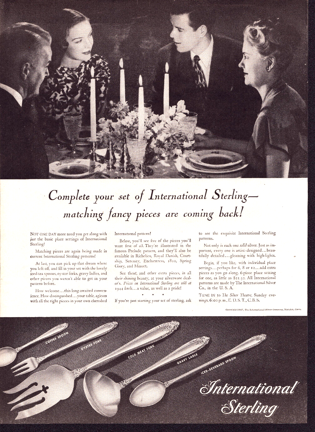1947 International Sterling Silverware - Matching Fancy Pieces - Vtg Print Ad Condition: Used; original vintage condition with typical age-related wear, including slight age toning. Despite these signs of age, the ad retains its visual appeal and is suitable for collectors and enthusiasts. See photos for details. Description: This 1947 advertisement features International Sterling Silverware, highlighting the return of matching fancy pieces to complete your collection. The ad showcases detailed illustrations of pieces like the gravy ladle, cold meat fork, and coffee spoon in exquisite patterns such as Prelude, Royal Danish, and Spring Glory. An elegant vintage dinner setting reinforces the timeless beauty of International Sterling silverware, perfect for collectors or those seeking vintage charm. Details: Year: 1947 Category: Silverware Brand: International Sterling Product: Silverware Color: Black & White Features: Authentic vintage magazine advertisement Size: Approx. 10 ¼ x 13 ½ inches Shipping: Packaged with care in a rigid mailer for protection. Combined shipping available for multiple ads. Why Buy This Item: This rare 1947 International Sterling ad evokes the elegance of post-war America, showcasing timeless silver patterns. Perfect for framing or gifting to a collector, this ad combines historical significance with classic design. Visit My Store: Check out more vintage items at Kelly Vintage Market ! r1