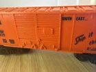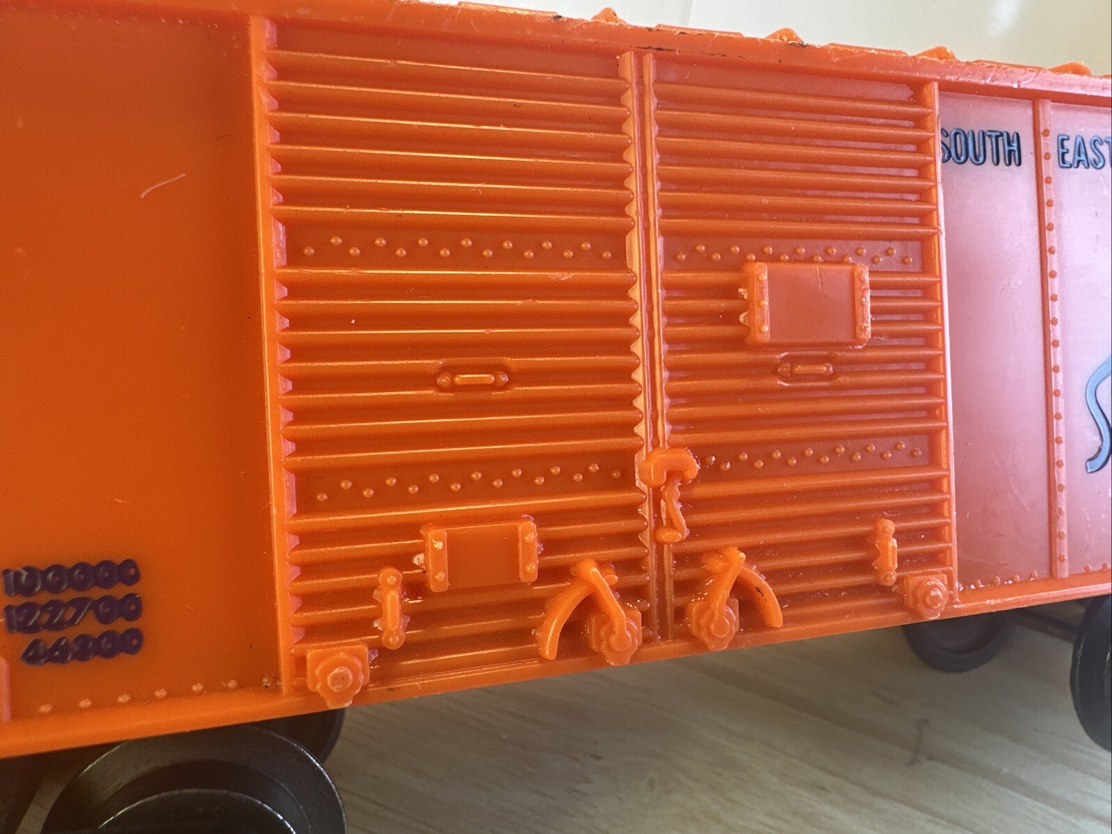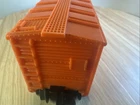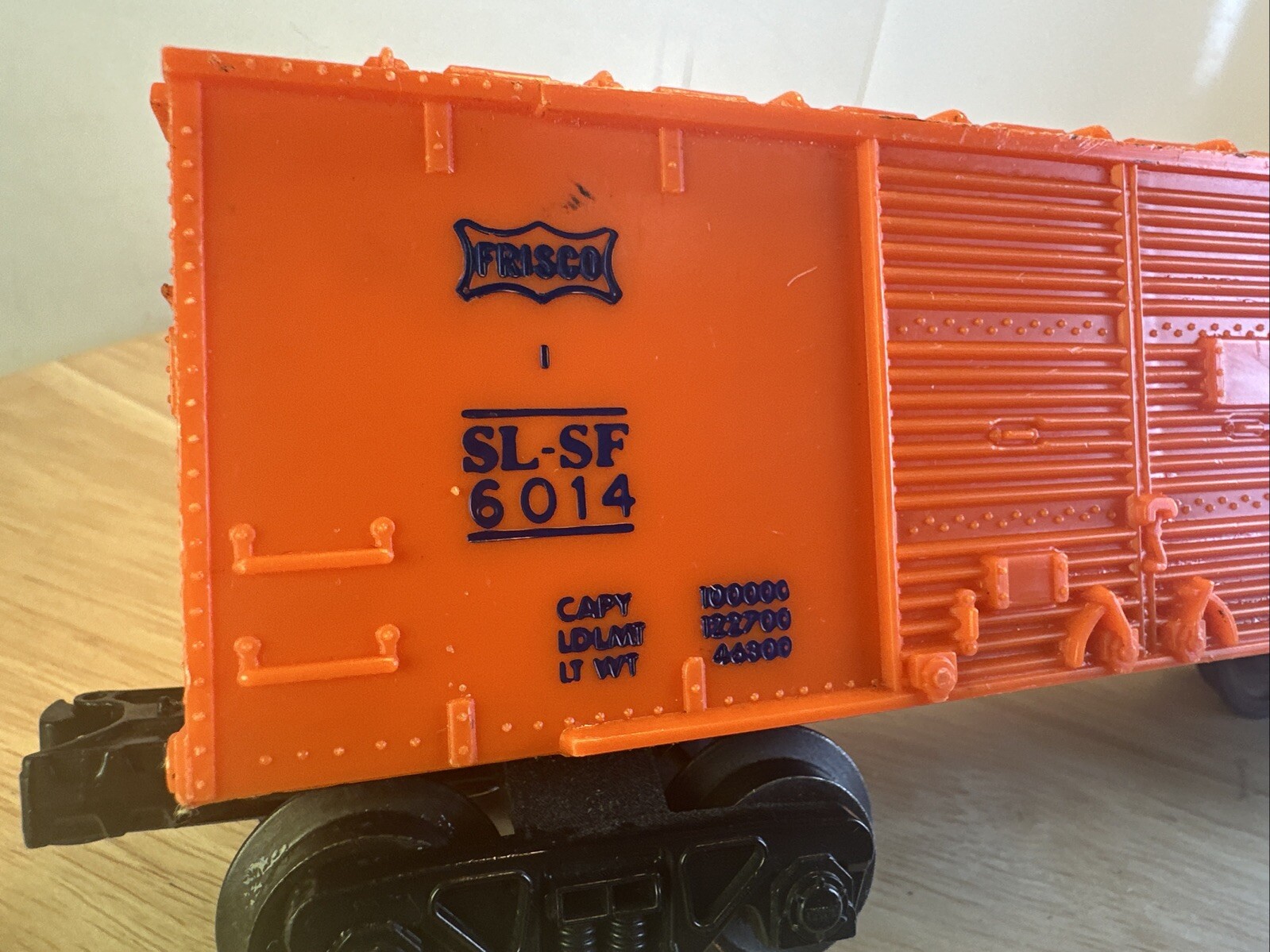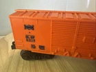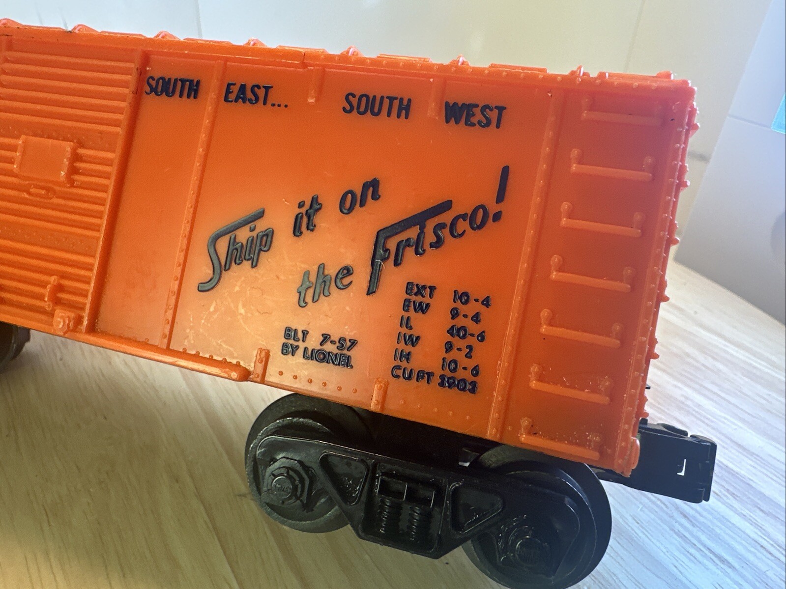 SOLD AS USED LOOKS UNUSED HARD TO FIND POSTWAR LIONEL CLEAN UNDAMAGED ORANGE PLASTIC WITH KNUCKLE COUPLERS NO RUST ON METAL AXLES BLUE READABLE MARKINGS AND GRAPHICS ON EACH SIDE LIONEL O GAUGE FROM 1957 ITEM WILL BE SECURELY WRAPPED AND QUICKLY SHIPPED WITHIN ONE BUSINESS DAY SOLD AS IS CONDITION thanks