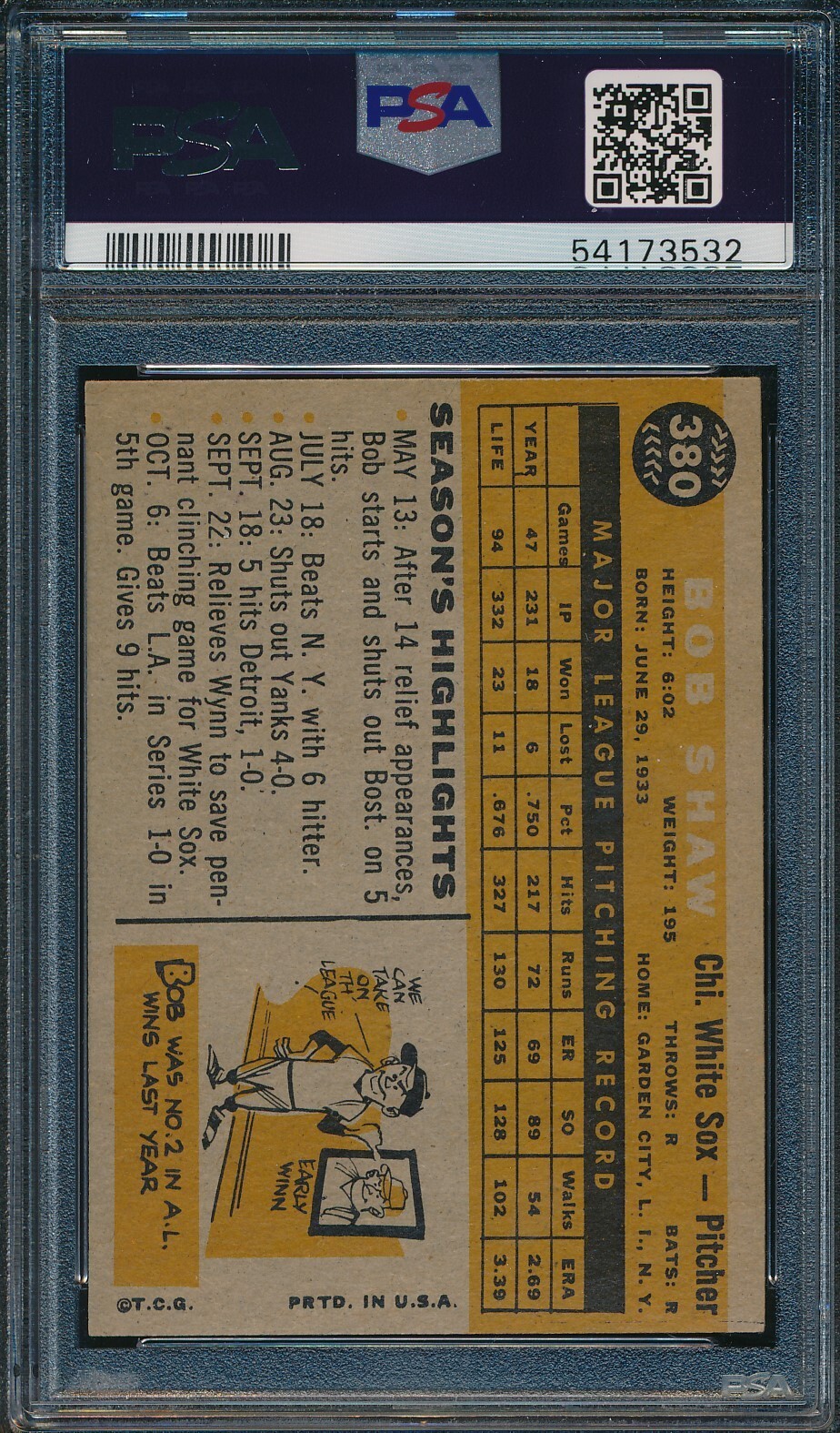 This card is in fantastic condition with a sharp PSA 8.5 grade—perfect for any serious collector. Bob Shaw's classic design looks pristine, and the vibrant colors really stand out. A must-have for vintage baseball fans, it's both a beautiful addition to your collection and a solid long-term investment. Very happy with this purchase!